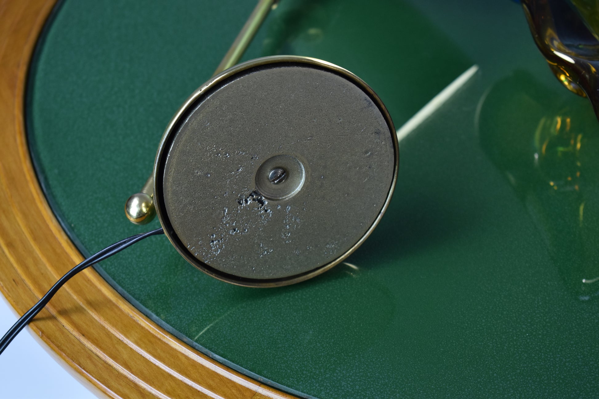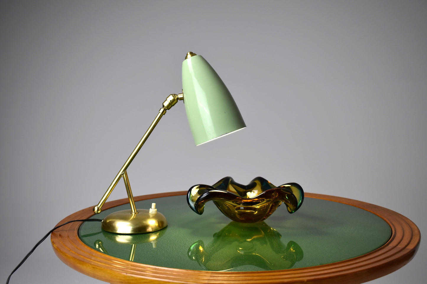 A beautiful Italian Mid-Century Modern vintage desk lamp with cone shade and double articulating solid polished brass structure. In rare original mint green color. Italy. Circa 1950's Professionally re-wired and tested Fits Bulbs E26 / E27 European electrical system works in the USA with an adapter.