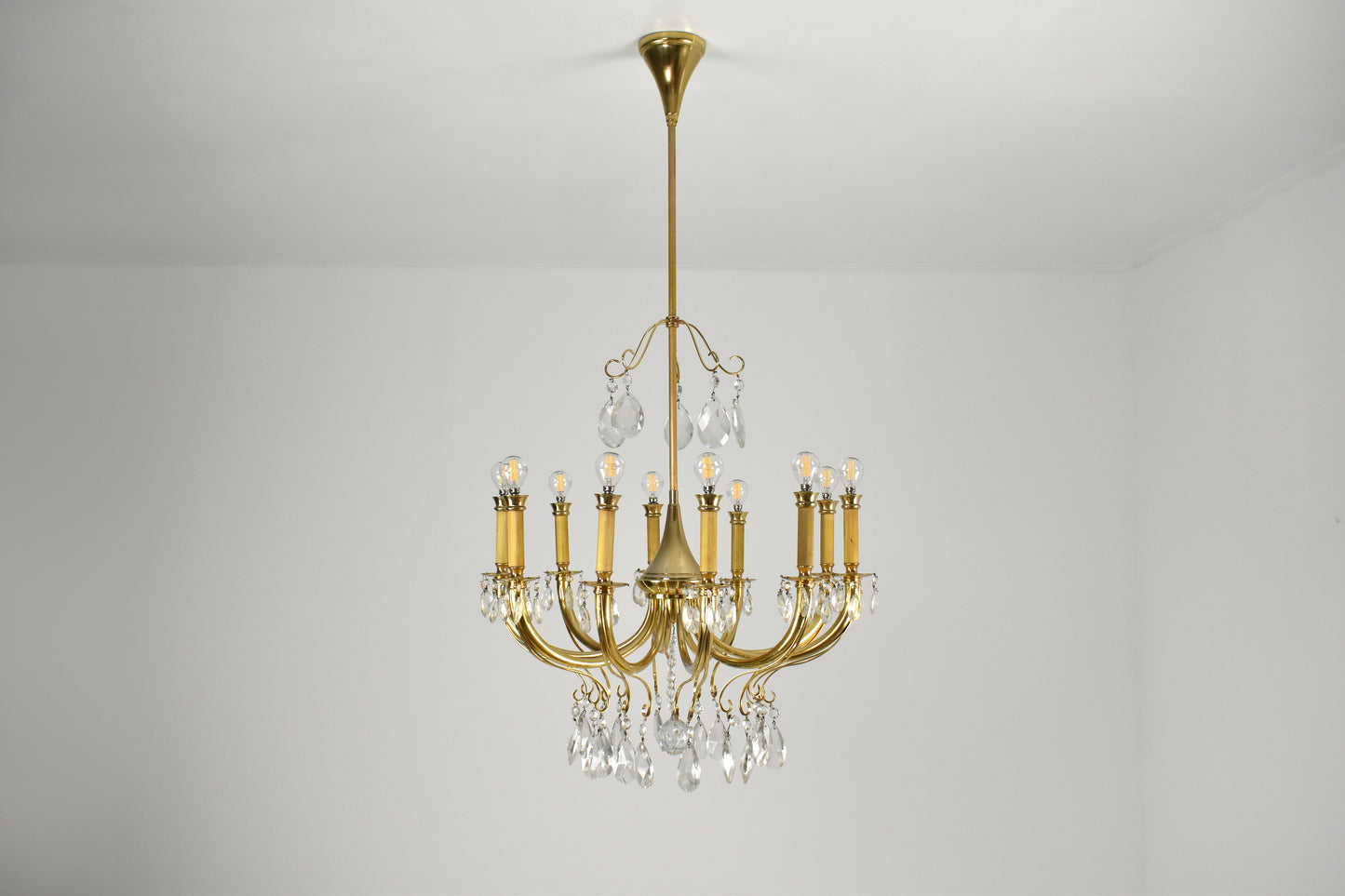 This rare model features ten sweeping candelabra‑style arms in warm patinated brass, each adorned with faceted crystal drops. Suspended from its original tapered brass canopy, the design combines Baroque Revival opulence with the clean lines of mid‑century Italian lighting.