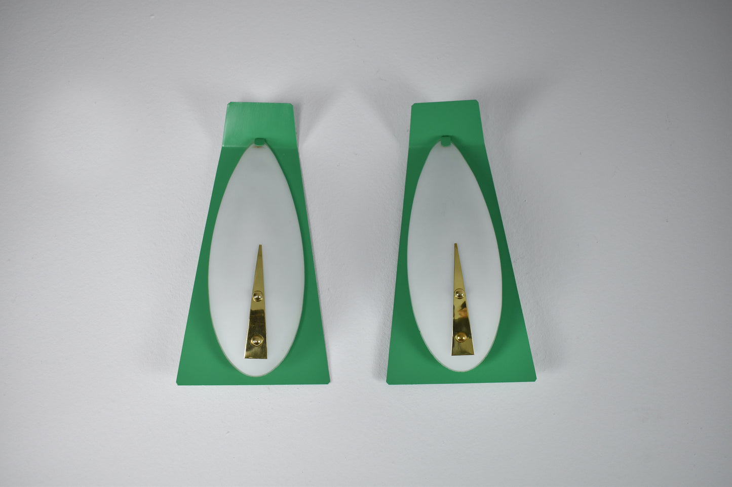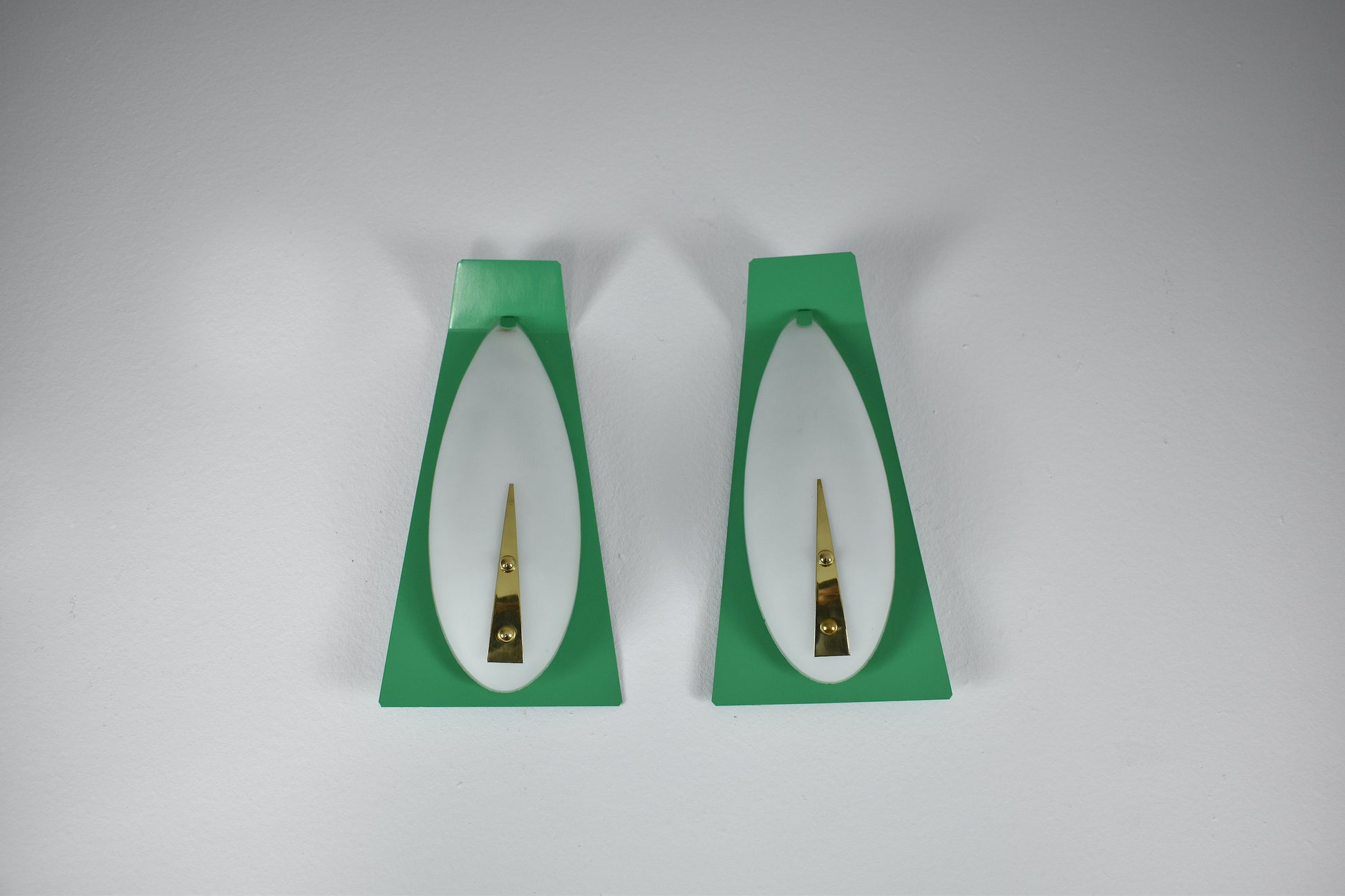 A beautiful geometrically shaped pair of Italian vintage sconces with white sandblasted round glass shades, sophisticated brass detail, and a mint green backplate. Italy. Circa 1950's. In fully restored condition with a re-painted backplate and polished brass.