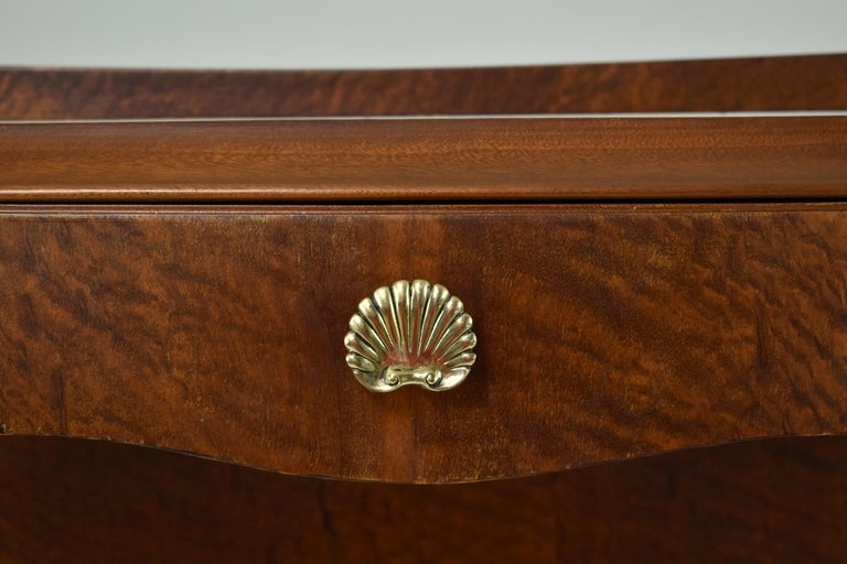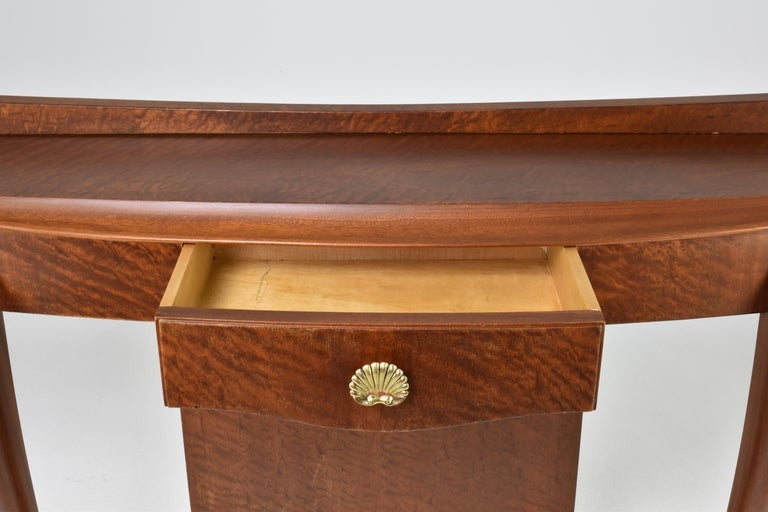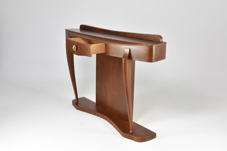 This magnificently crafted table features carved details on the curved base and two splayed legs on the sides. The central drawer is adorned with a beautiful brass doorknob adding a luxurious touch that harmonizes with the table's overall design. This table boasts an intricate design that captures the essence of mid-century Italian aesthetics.