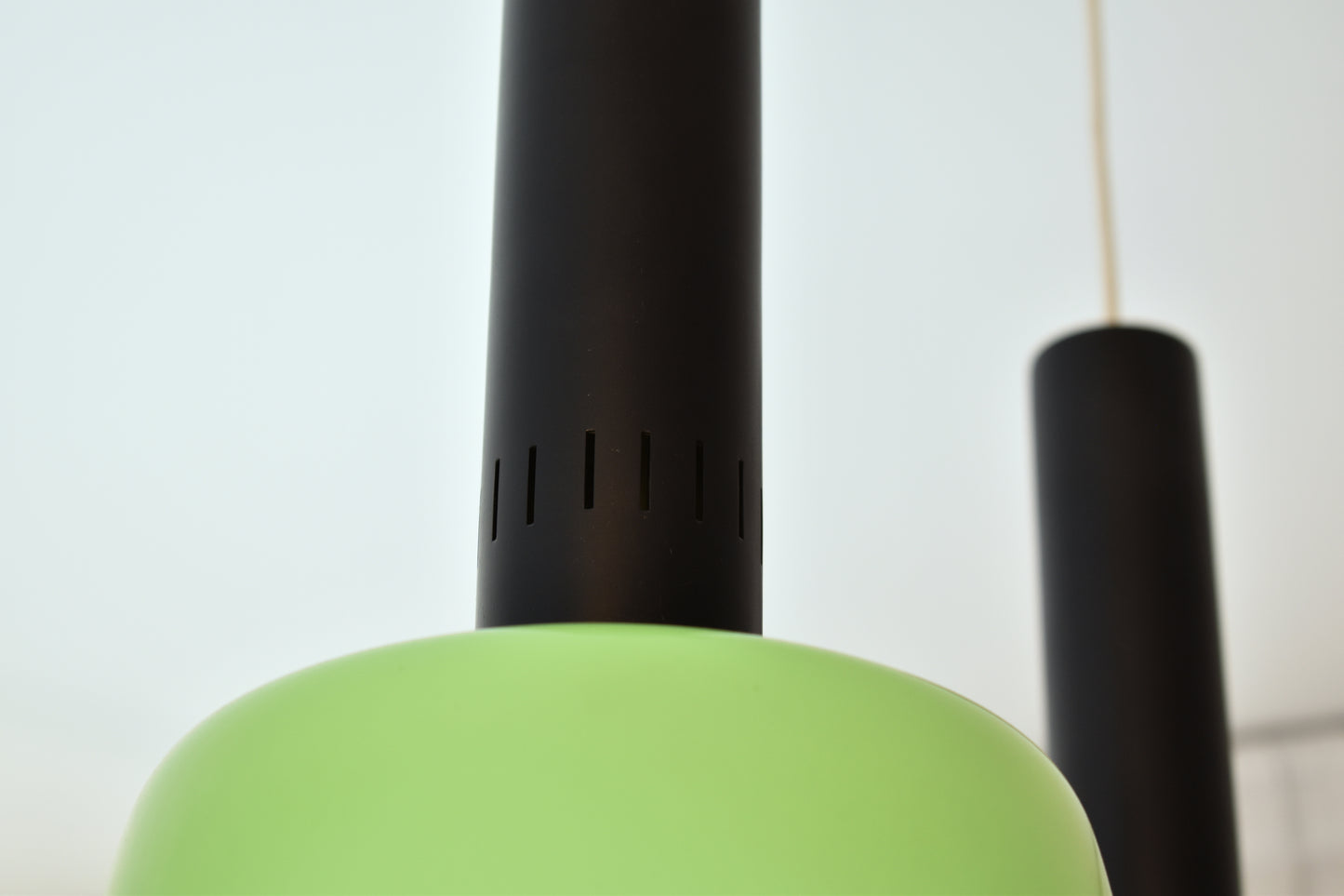 20th-century vintage pendant by Stilnovo designed with two apple green Murano handblown glass shades. The structure is composed of two long black lacquered aluminium.