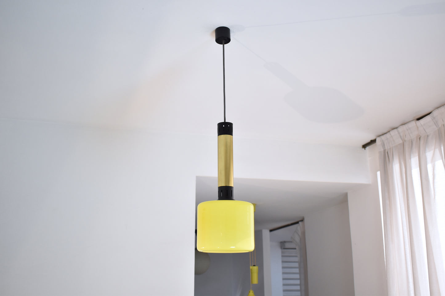 20th-century vintage pendant by Stilnovo designed with one yellow Murano handblown glass shade. The structure is composed of a long black lacquered aluminium and a polished gold brass structure.