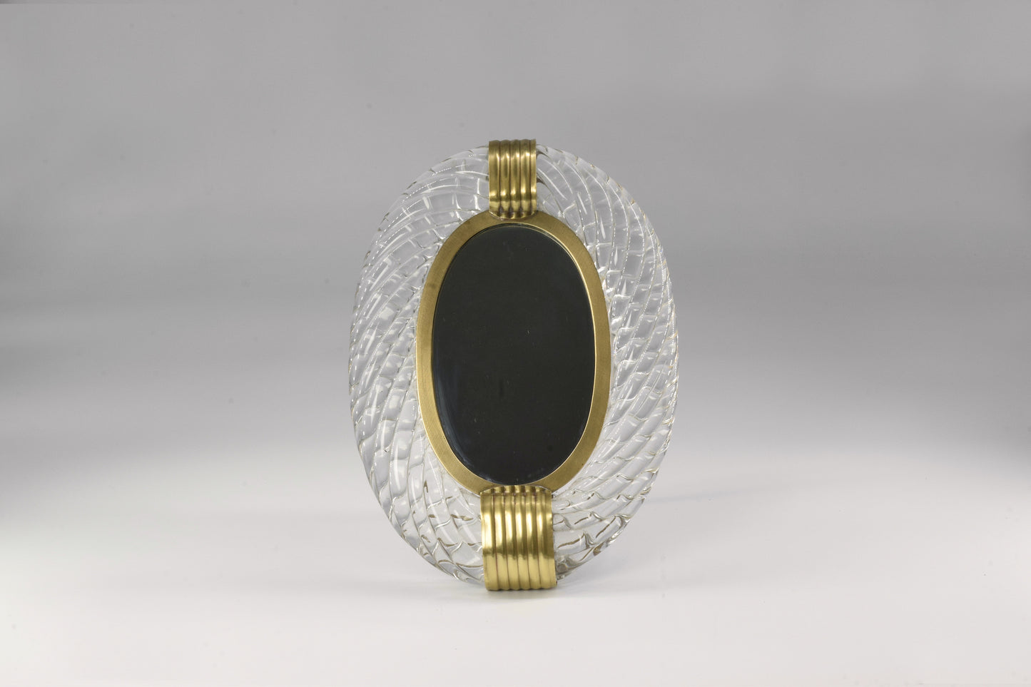 An astounding mid-century table mirror crafted by Venini and designed by Carlo Scarpa around the 1950s. This beautiful oval-shaped decorative piece is emphasized by the hand-blown transparent Murano glass frame and luxurious brass details. Italy. Circa 1950s.