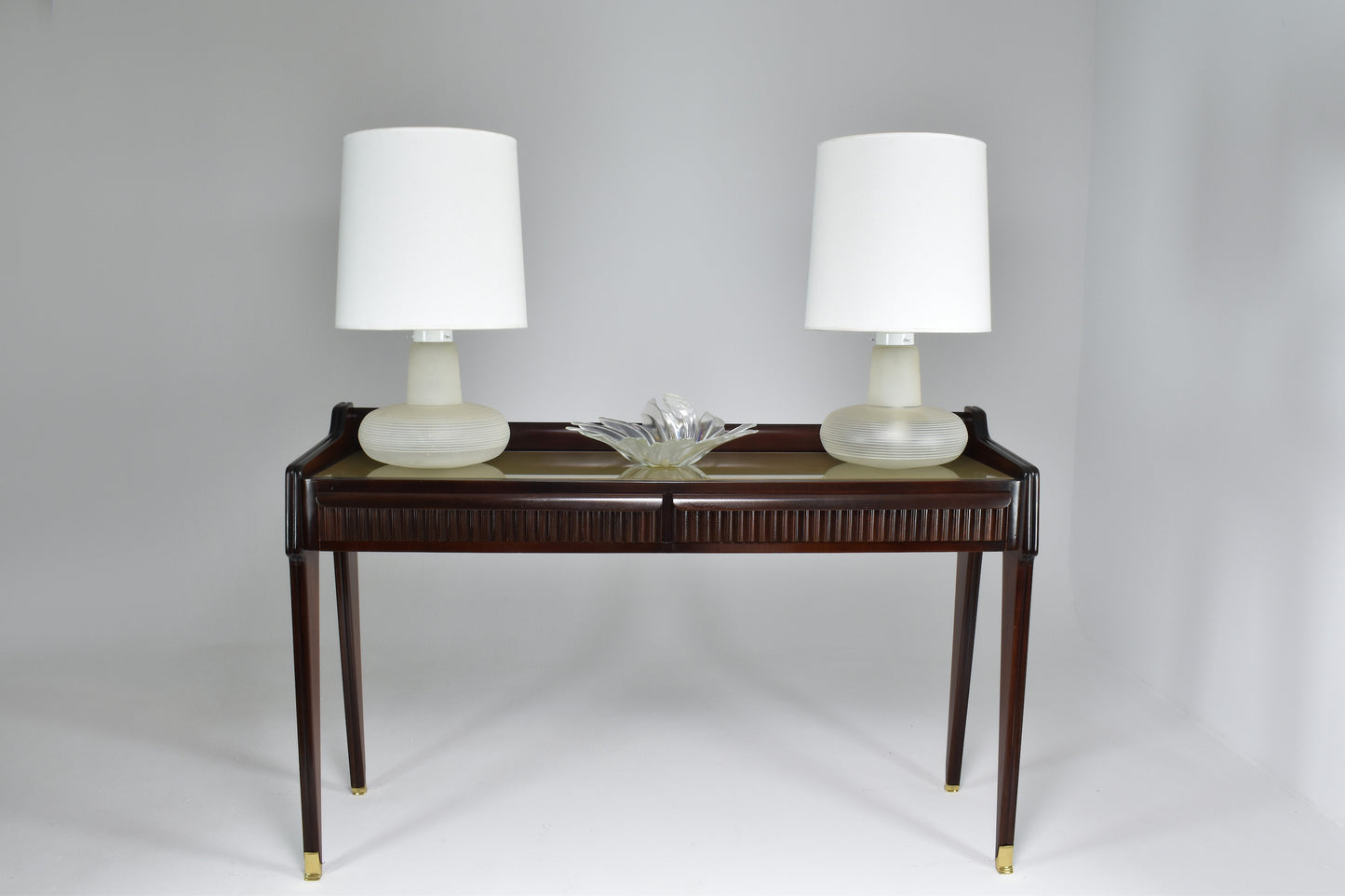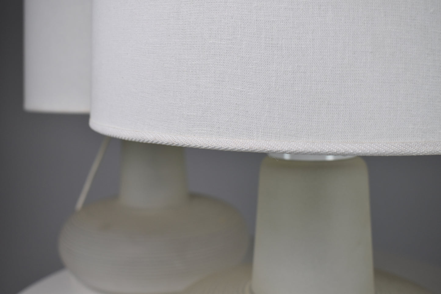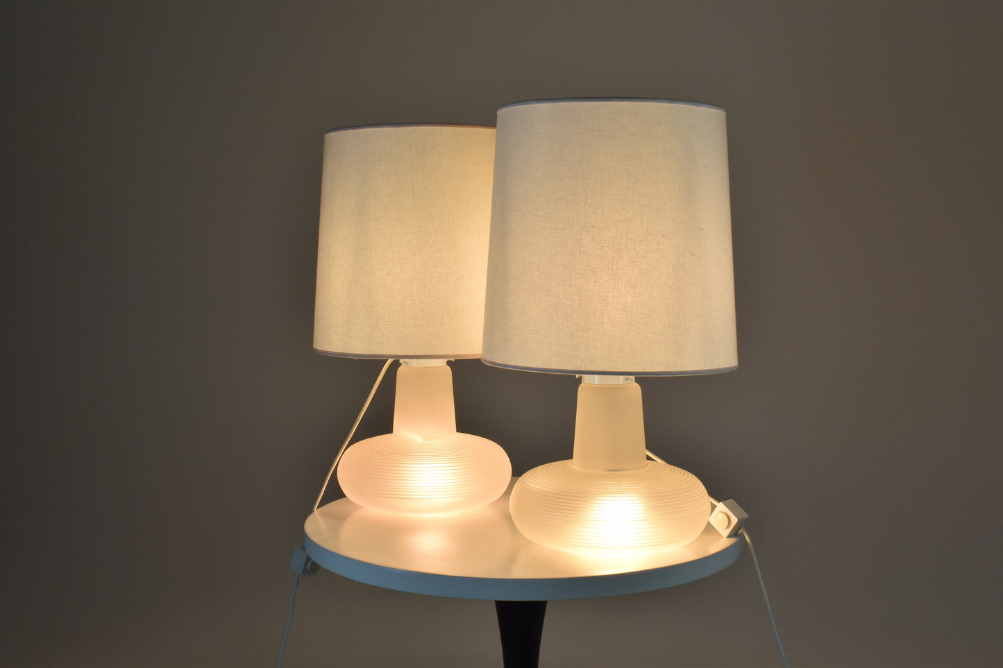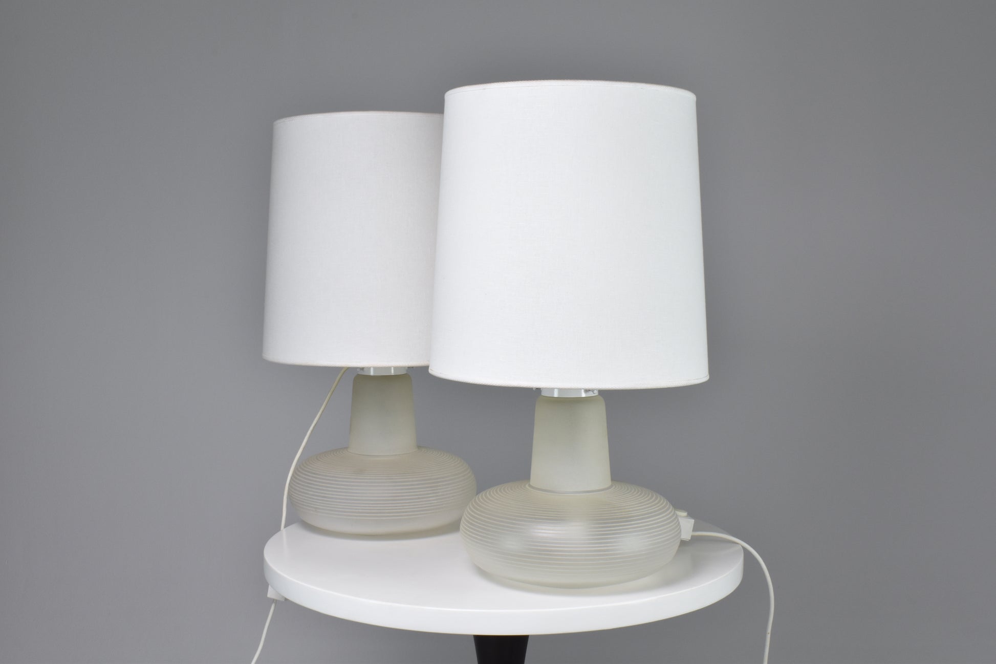 Fantastic set of two curvacious vintage 20th-century table lights attributed to Italian Murano glass expert Carlos Nason for Mazzega around 1960-1970. The beautiful transparent glass is sandblasted at the top and designed with horizontal lines all-around. Custom white lampshades are new. Wiring is professionally checked. E27 and E26 standards are interchangeable, meaning a European E27 base will fit in a US E26 socket. If you live in the US, a simple adapter will do.