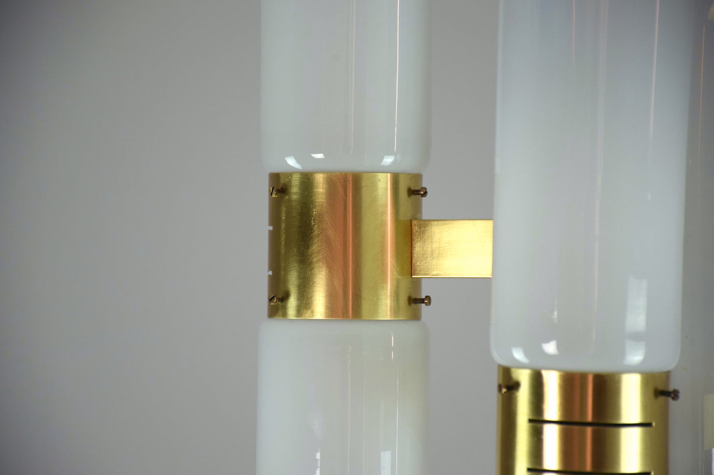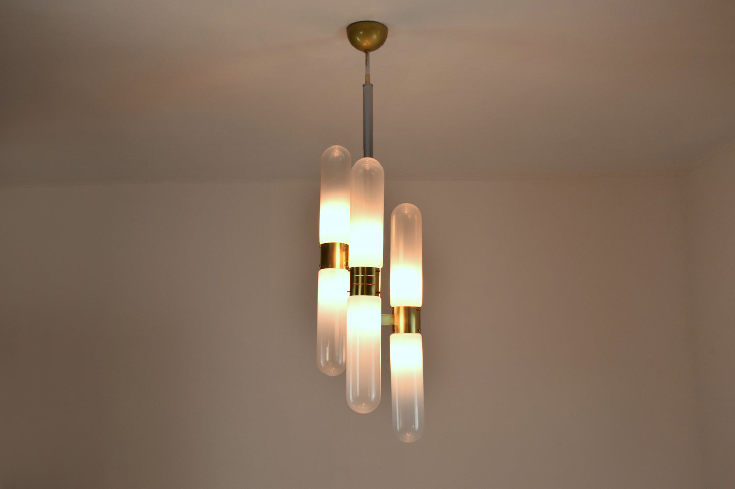 A Mid-Century Modern 1960's collectible light pendant/chandelier designed by notable Italian designer Carlo Nason for Mazzega who was born into a family of expert glassmakers. The three-shade piece is designed in Murano opaline blown glass and chic brass details. The sophisticated drop is made of chromed brass and the fixing plate is painted metal. Italy, 1960's design.