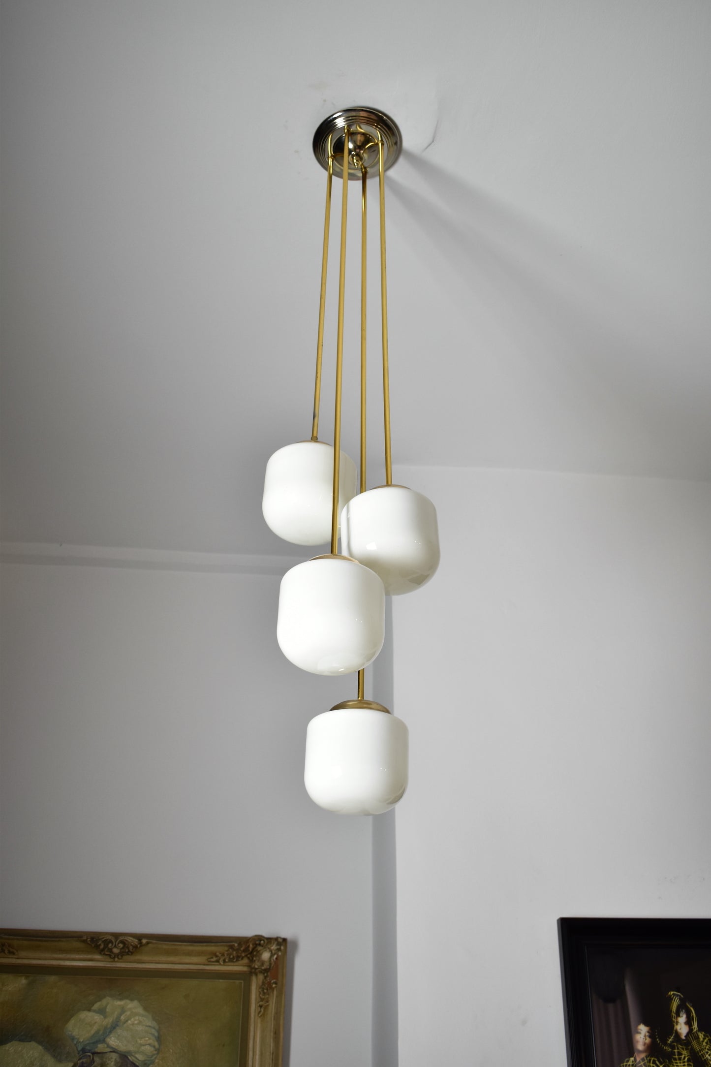 A chic Italian vintage pendant composed of four lights from the late 20th century. The beautiful organic-shaped opaline glass shades are highlighted by classic polished brass drops. The steel metal cover plate measures 20cm. All glasses are in great shape with no cracks. A timeless Italian mid-century design.