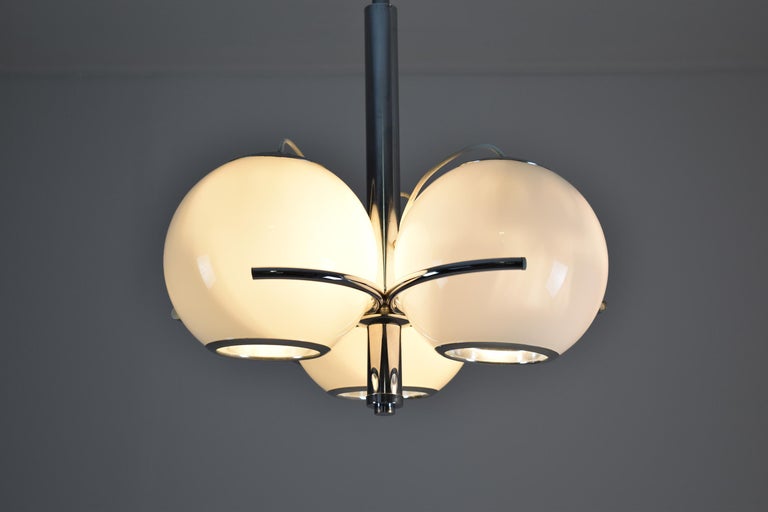A 20th-century vintage pendant by notable Italian manufacturer Reggiani from the 1970's. This lighting piece is in beautiful condition and is designed with a chic stainless steel structure and three opaque glass globe-shaped shades. This piece is professionally re-wired with the highest standards and is universally compatible.