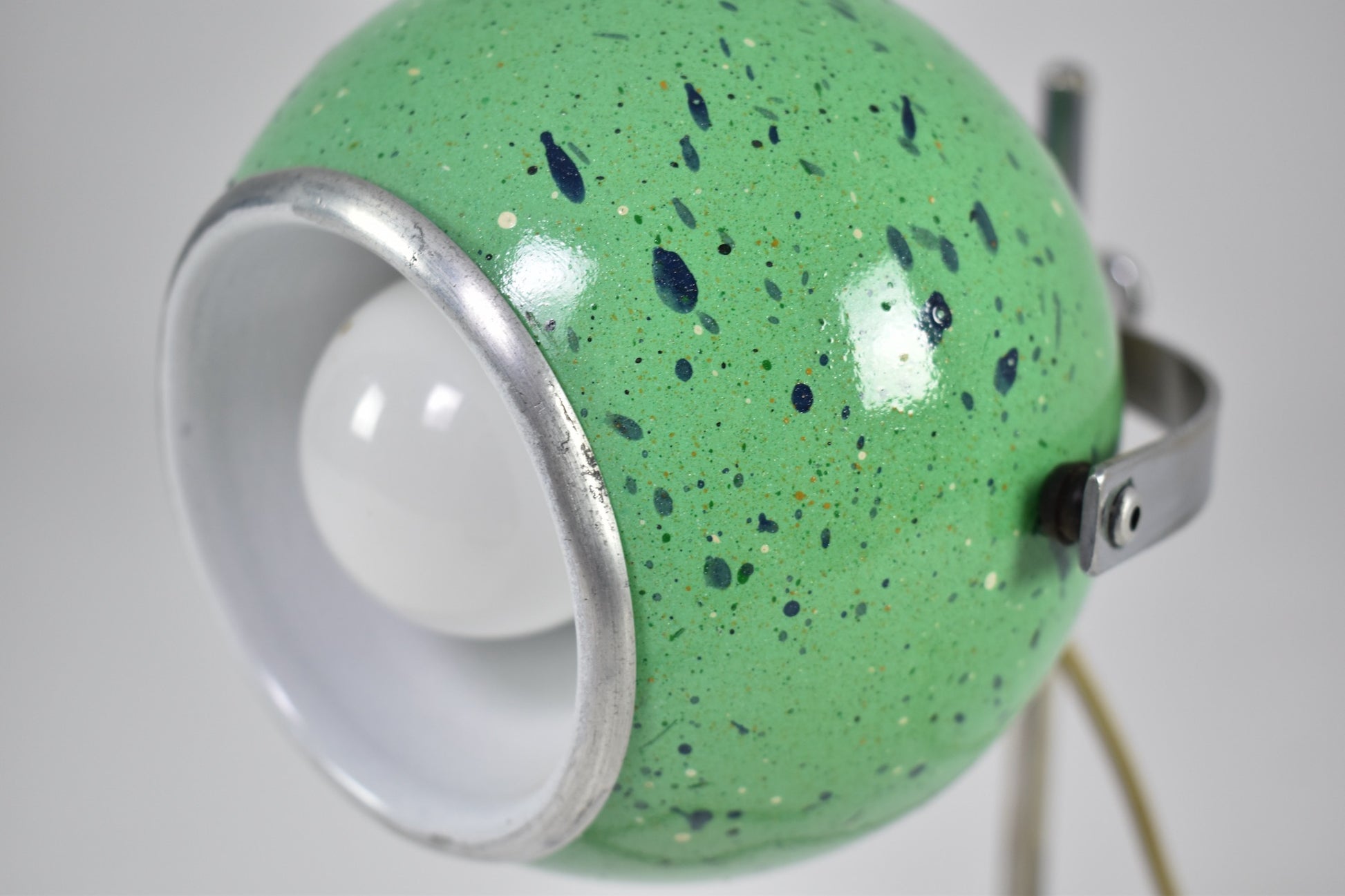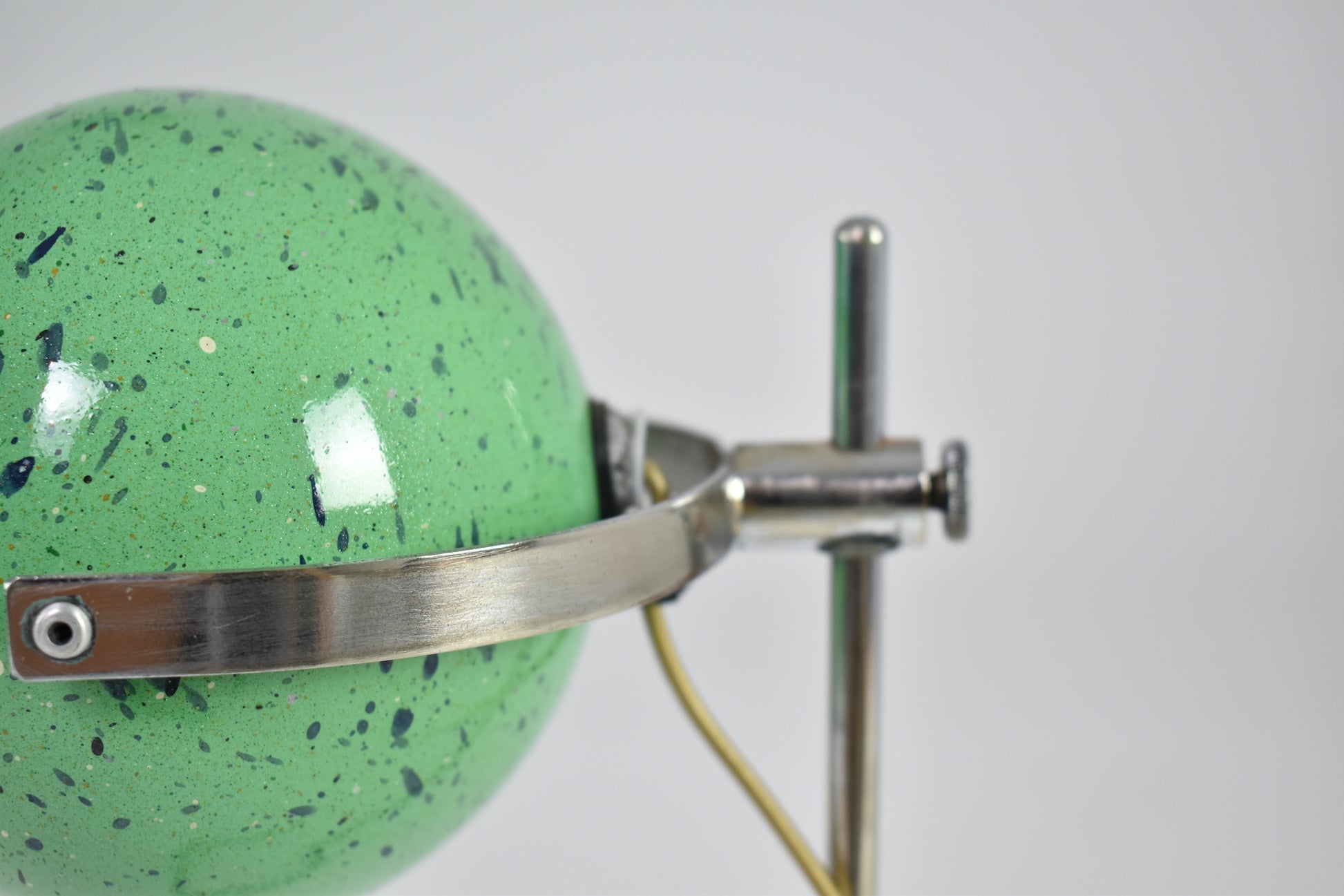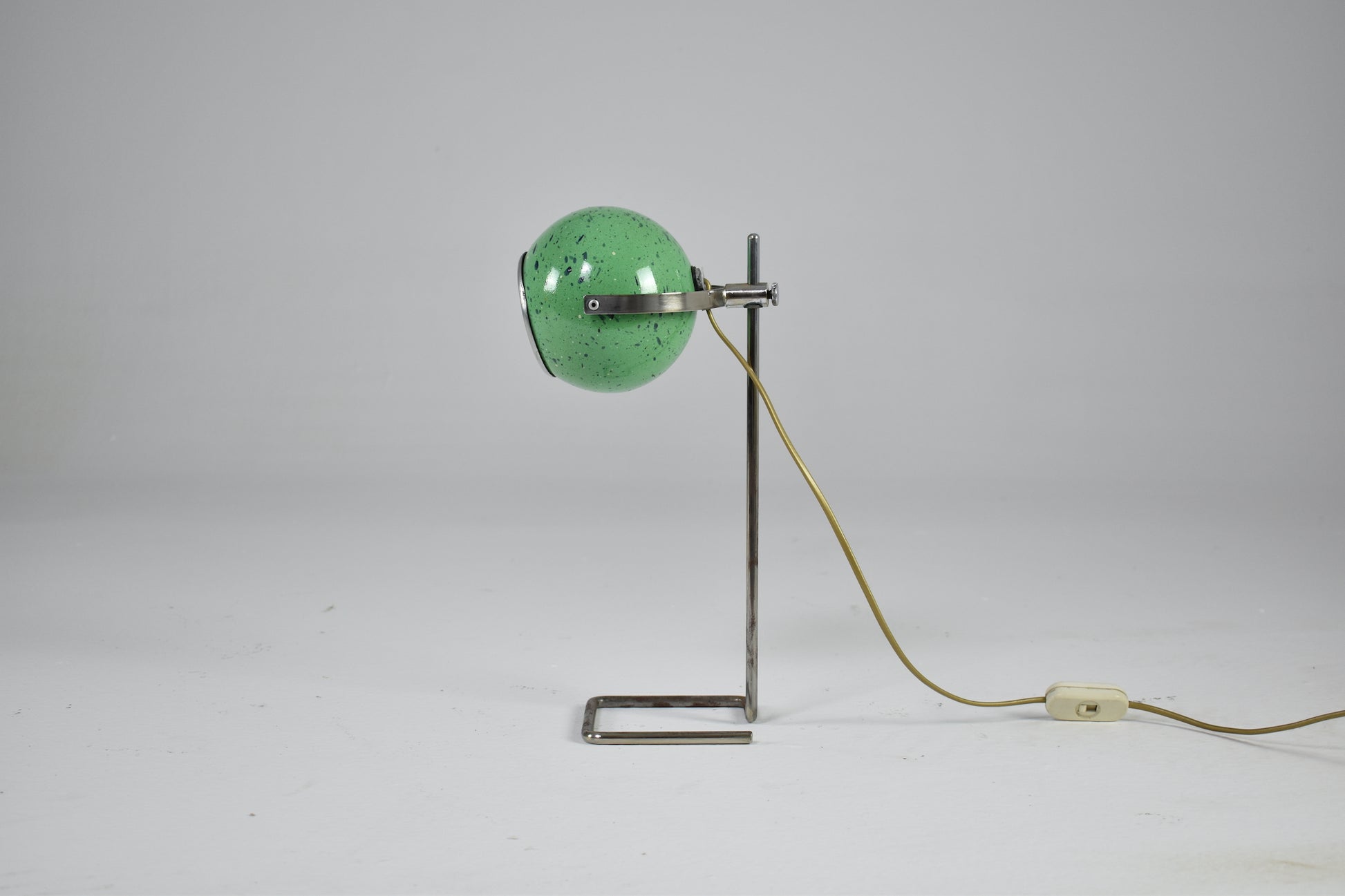 Playful Italian vintage Space Age desk lamp with an adjustable ball shade in apple-green speckled enamel and a satin-white internal reflector. The shade sits on a chromed steel rod base with inline switch. Perfect scale for a desk, bookshelf, or bedside. light, age-appropriate patina consistent with 1970s production.