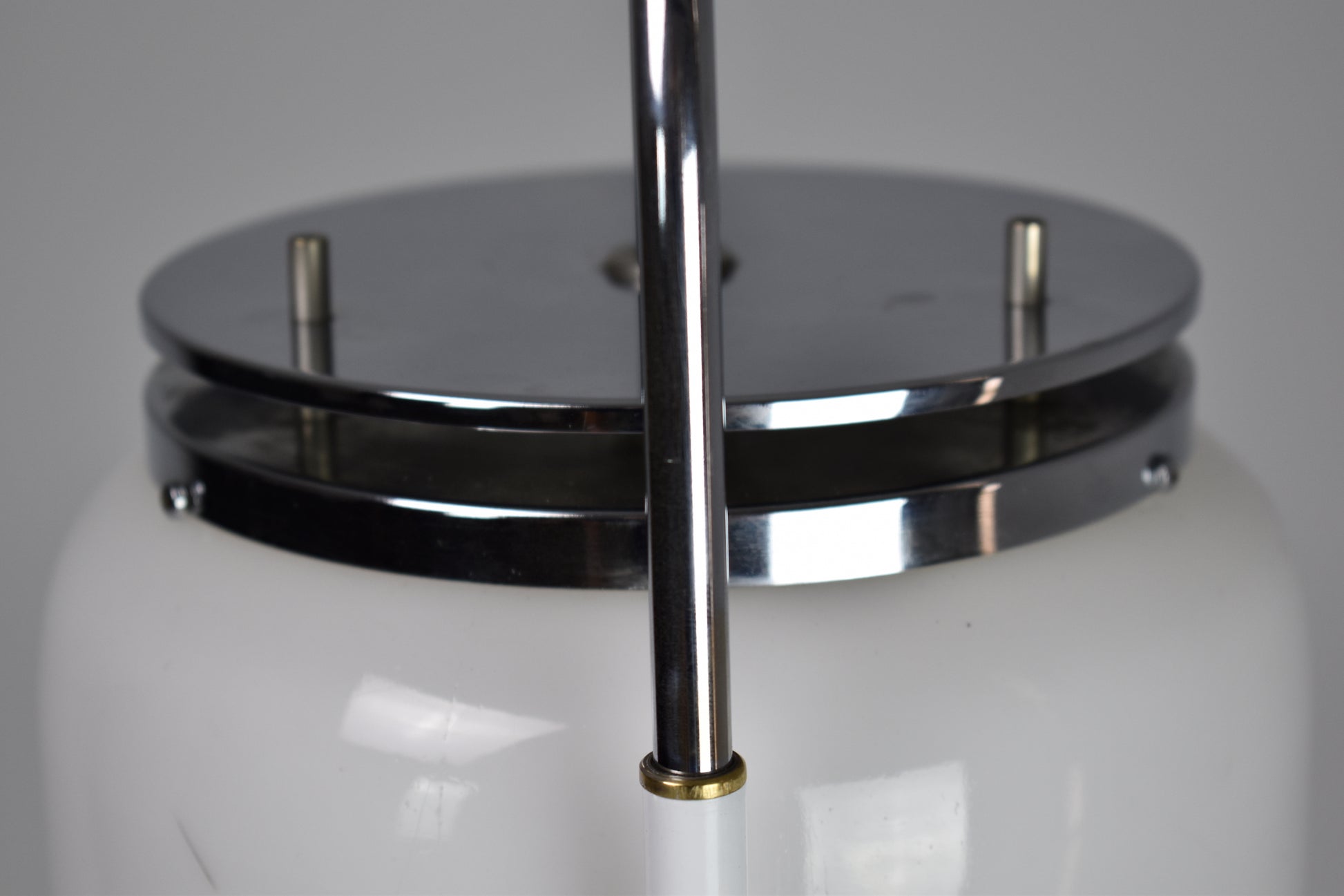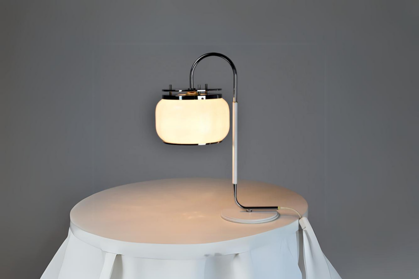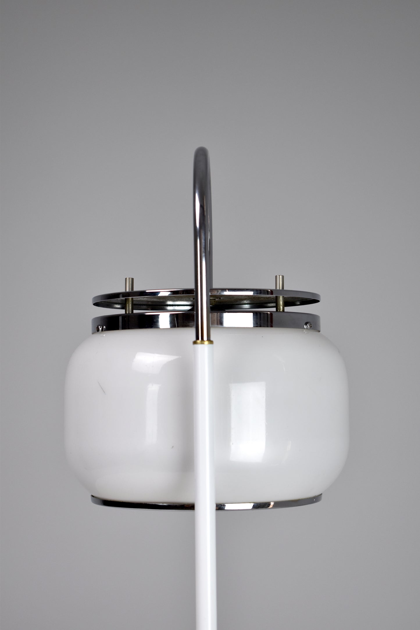 A very cool originally shaped table lamp composed of steel and designed with a plastic shade. Light switch at the cord. Restored condition.