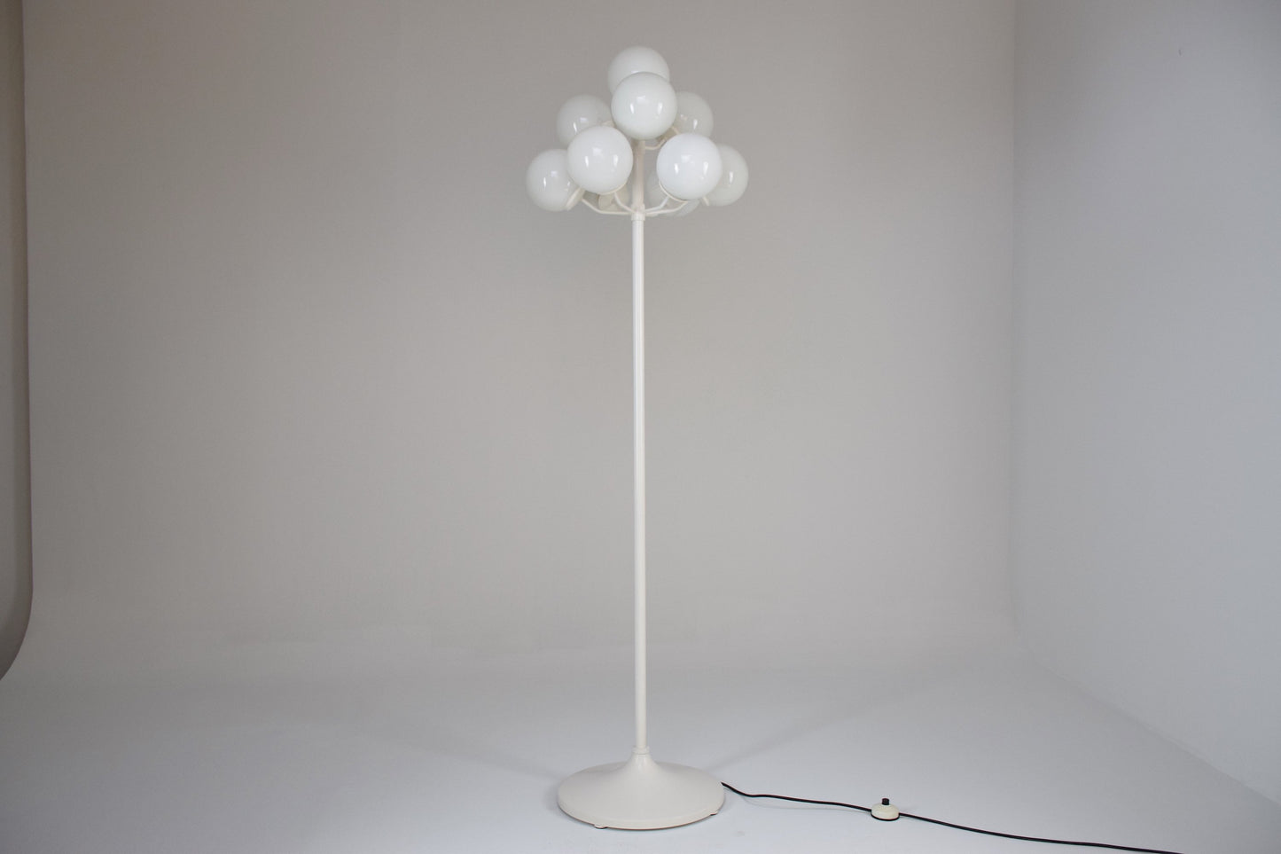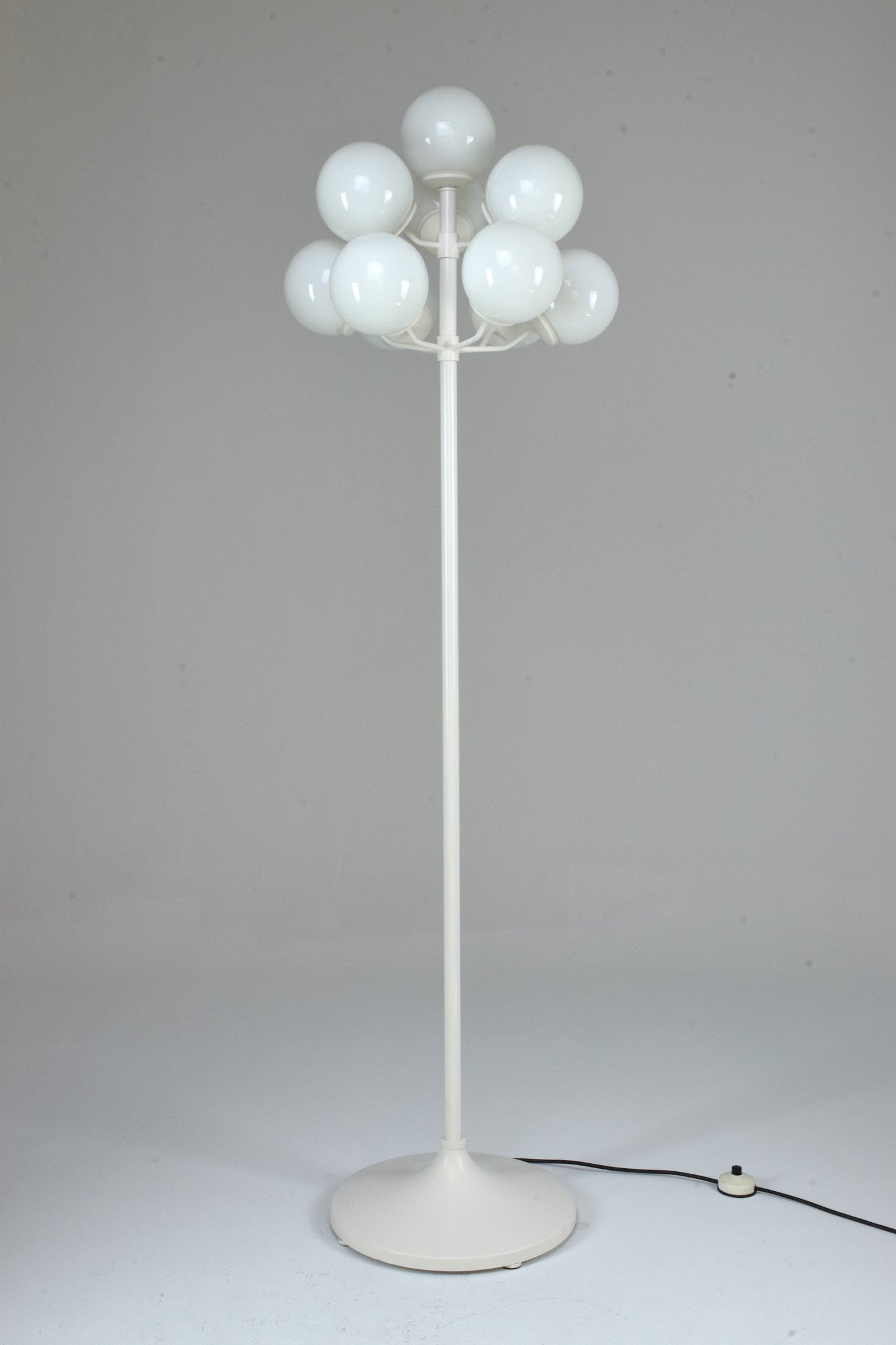 A 1960's vintage floor lamp in the style of Swedish designer Max Bill's iconic design. This piece is built with 10 atomic style boule opal glass shades standing on a white re-lacquered metallic structure.