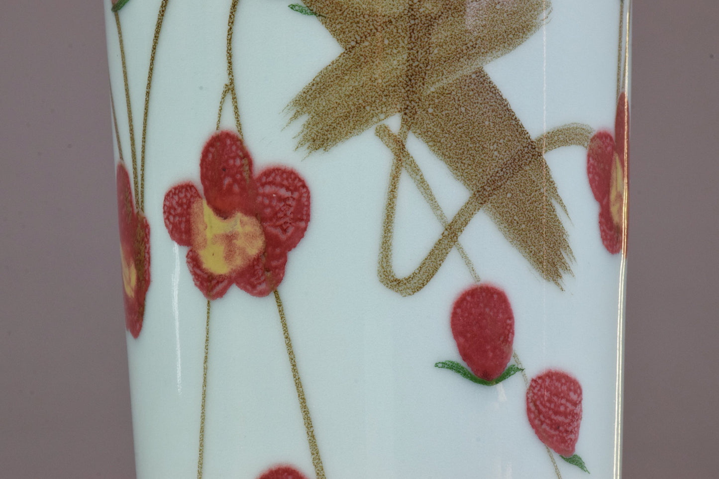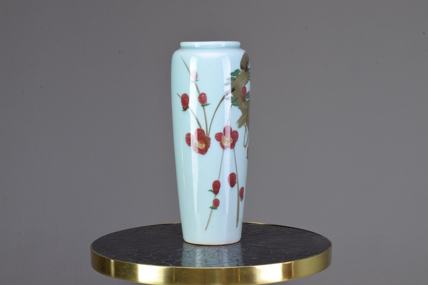 A late 20th-century Chinese hand-painted light blue ceramic vase with red flower patterns. Signed at the bottom with a name which is a famous mountain in China.