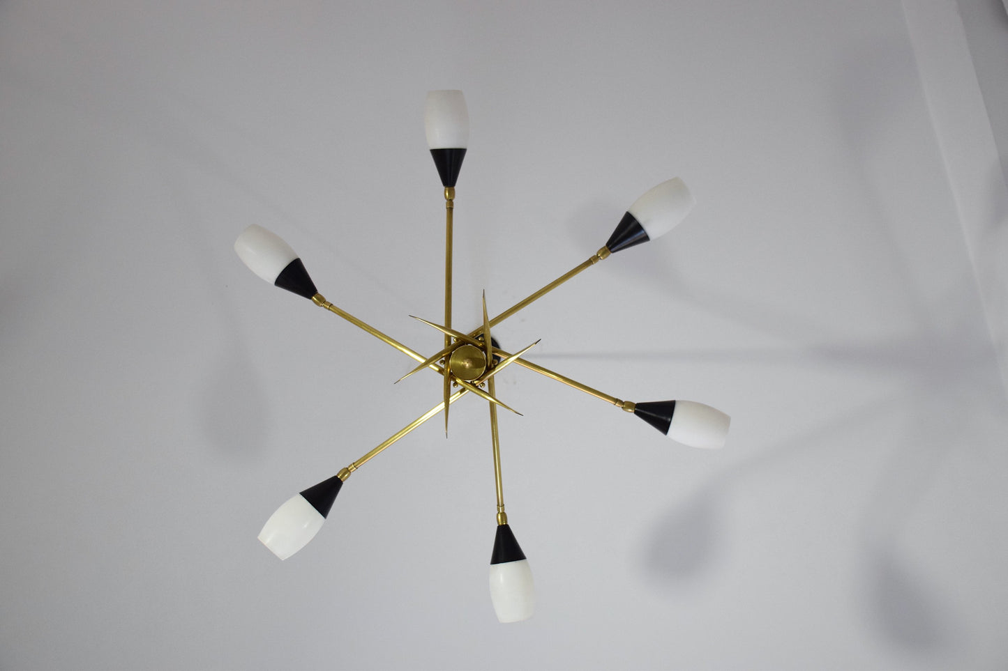 An Italian mid-century modern chandelier produced by Stilnovo in the 1950's in Sputnik style designed with a sophisticated brass structure and multidirectional aluminum and glass shades. In beautiful original condition.