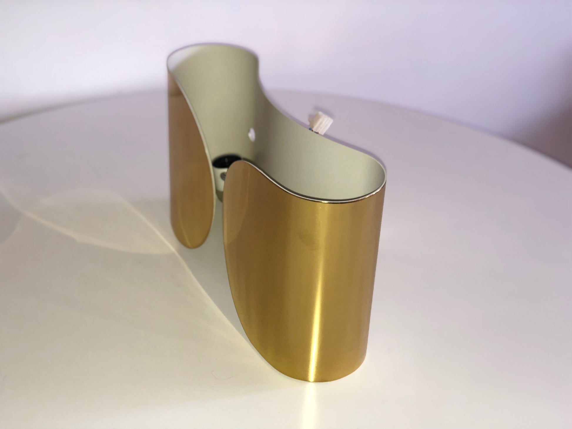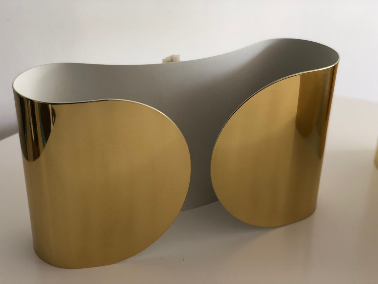 A pair of Foglio wall light sconces by Tobia Scarpa for Flos in a polished brass finish and white enamel interiors. Each curved design fits two lights and are in fully working condition. Each in their original boxes, plastic wrap and silver brackets. Lamps are unused. We have a total of three brass sconces, the other one is in another condition as well as two chrome lights in used condition.