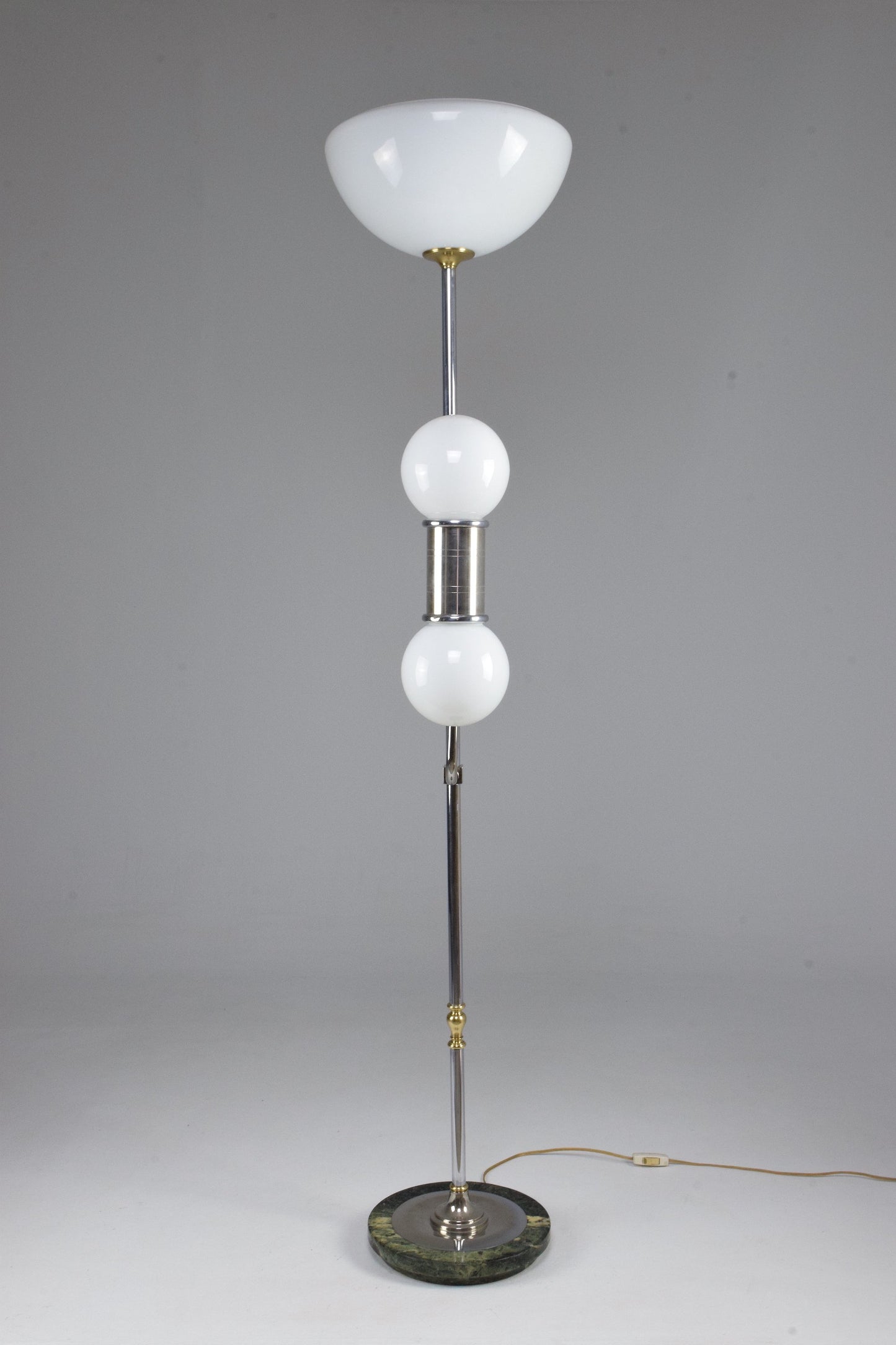 A stunning midcentury vintage floor lamp designed in chromed steel with two opaque Murano glass shades and a Guatemalan green circular base. The silver stem has polished brass details. Labeled Vetri Murano. Italy, circa 1950s.