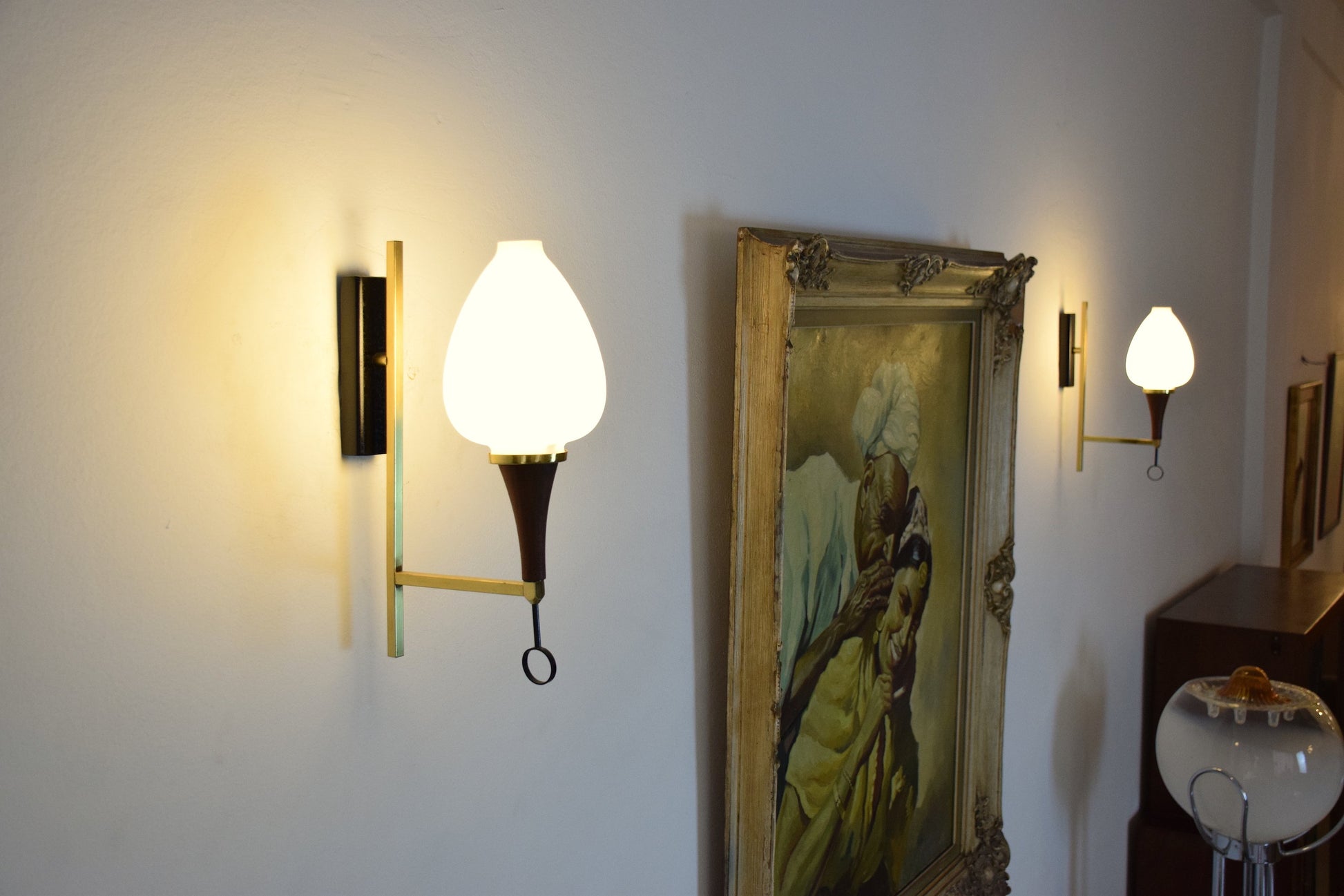 Pair of 20th-century vintage wall lights or sconces designed with brass, opaque glass shades, and a wooden base with a circular shaped detail. Stilnovo style. Italy. Circa 1950's. All our pieces are fully restored at our atelier and we only offer items that will last another lifetime. There may be light age-related wear but no hard damages or structural issues.