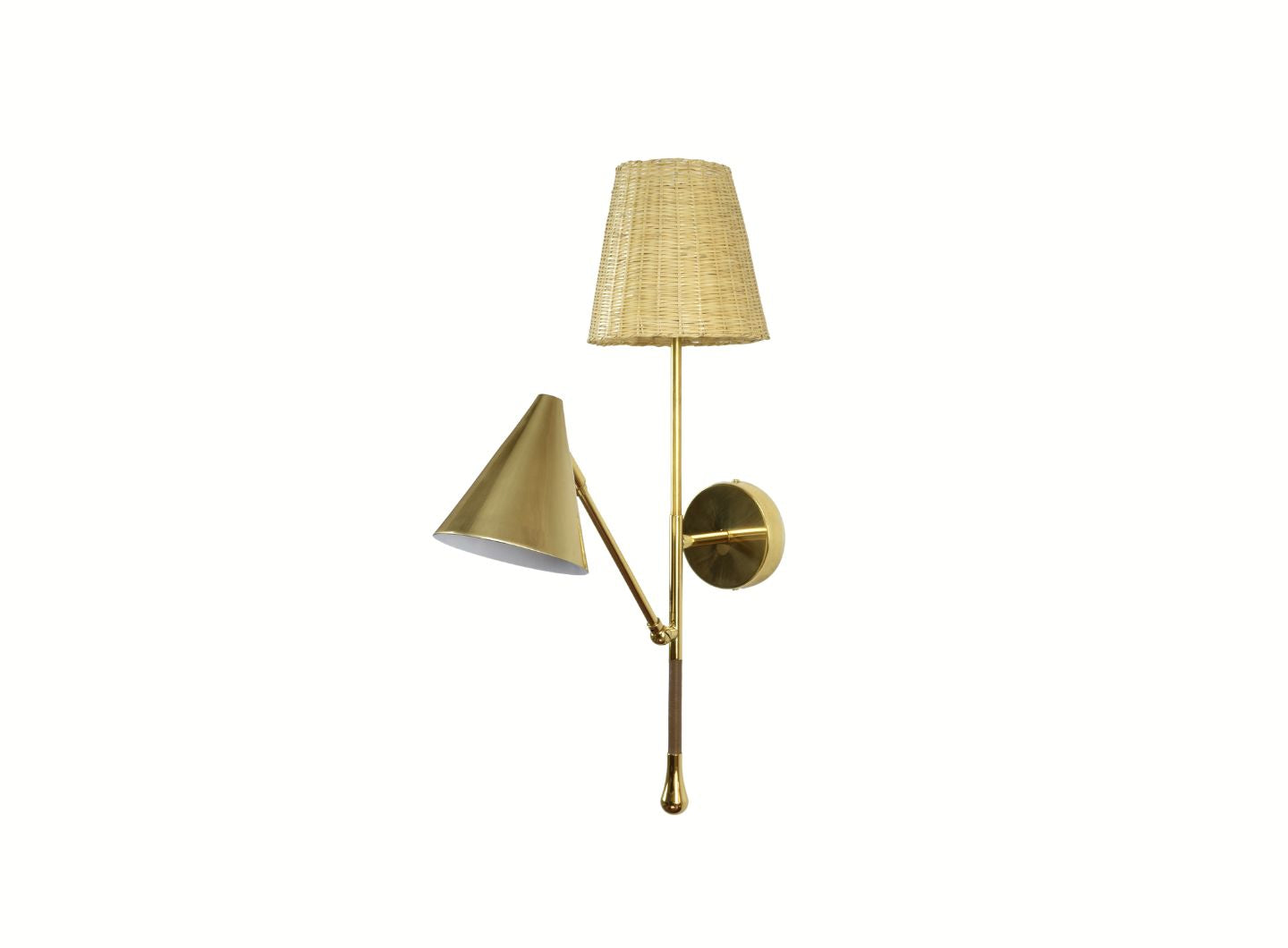 The Ancora W3 is a solid brass double wall light with a leather sheathed stem detail. The main structure tops a hand-woven wicker shade and the directional stem features a conic shade mounted with a moveable joint. Perfect as a bedside reading lamp or to illuminate wall art.