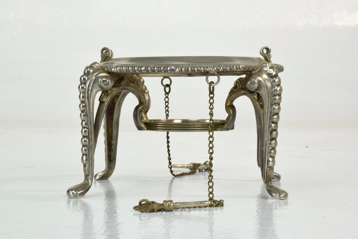 A fine English antique spirit tea kettle and burner stand from the Edwardian era in embossed aged sterling silver. With fluted embellishments, Chippendale style legs, an original wooden shaped handle. Hallmarked. England, 1906. 1131gr.