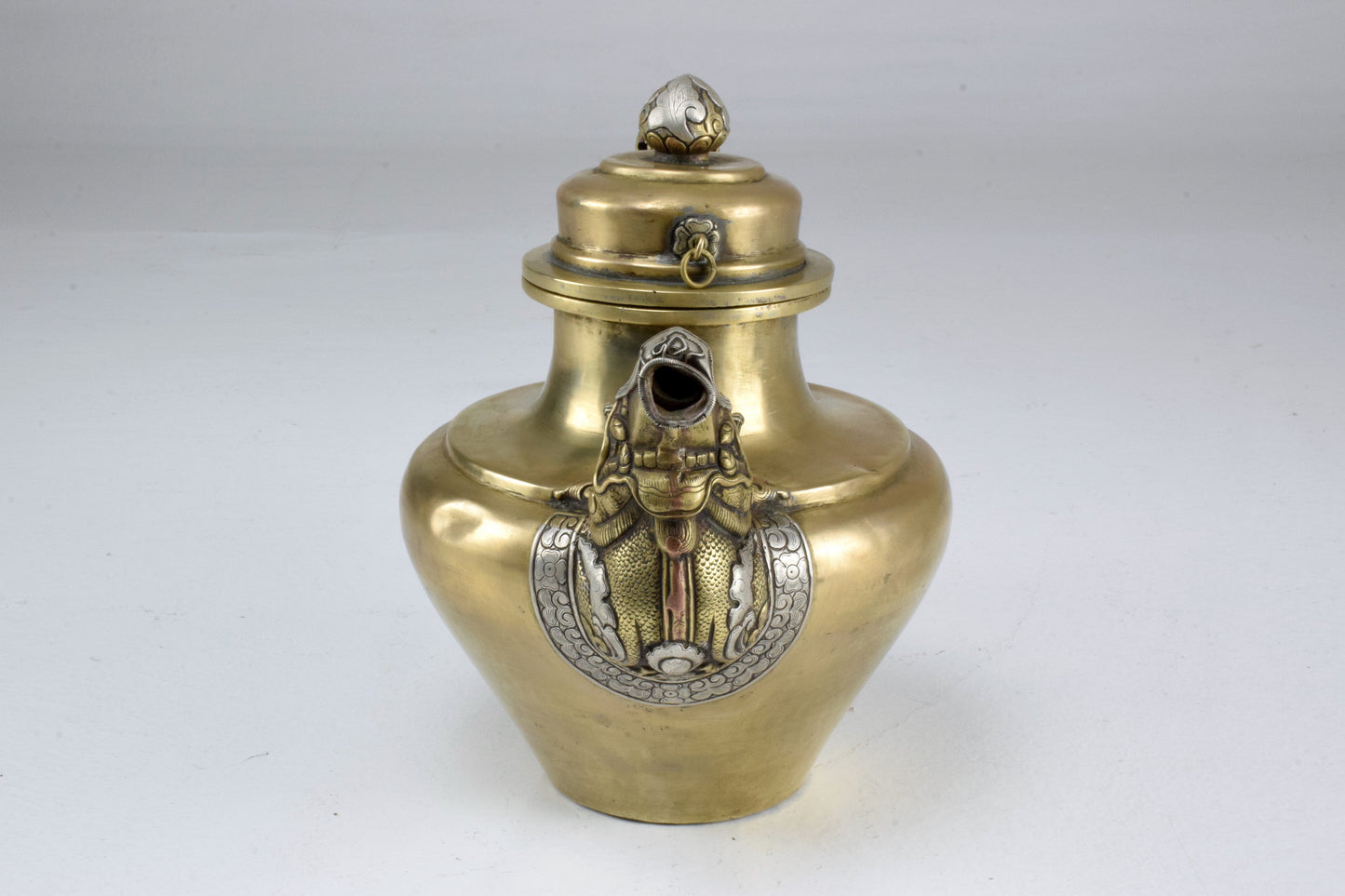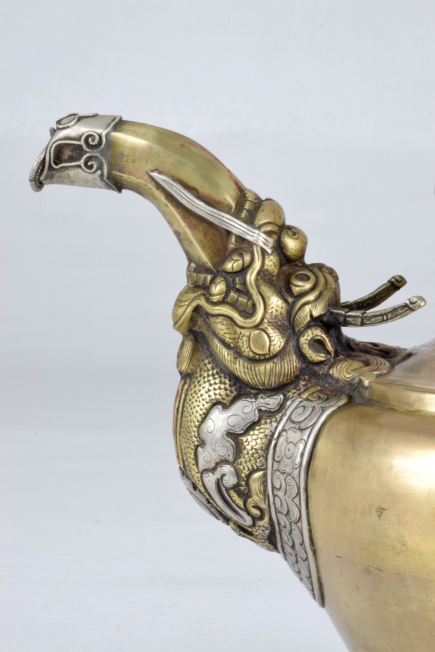 Astounding 18th-19th century Tibetan brass and solid silver teapot with intricate hand carved and sculpted details of dragon ornements. Purchased more than thirty years ago by our gallerist in the country. We recently polished it to highlight its brilliant condition.
