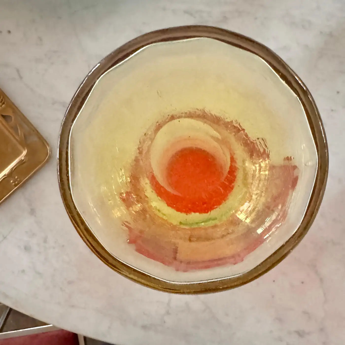 Hand-worked tool marks and the transitional ombré point to late-Victorian/Art Nouveau production from Bohemia or the English Stourbridge schools.