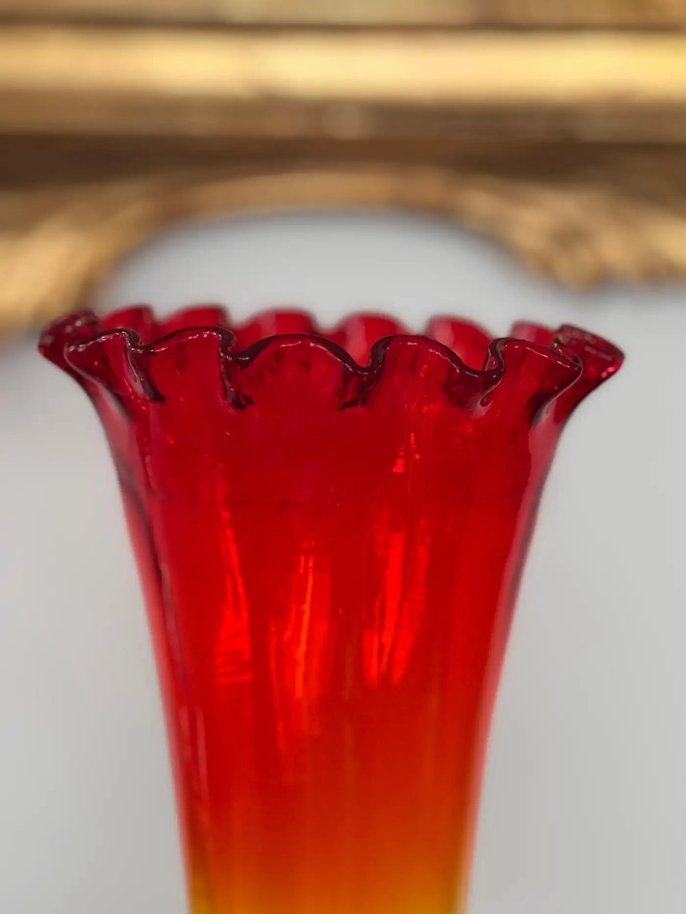 A vibrant Art Nouveau trumpet vase in Amberina (red shading to amber), c. 1890–1910 with ruffled rim.