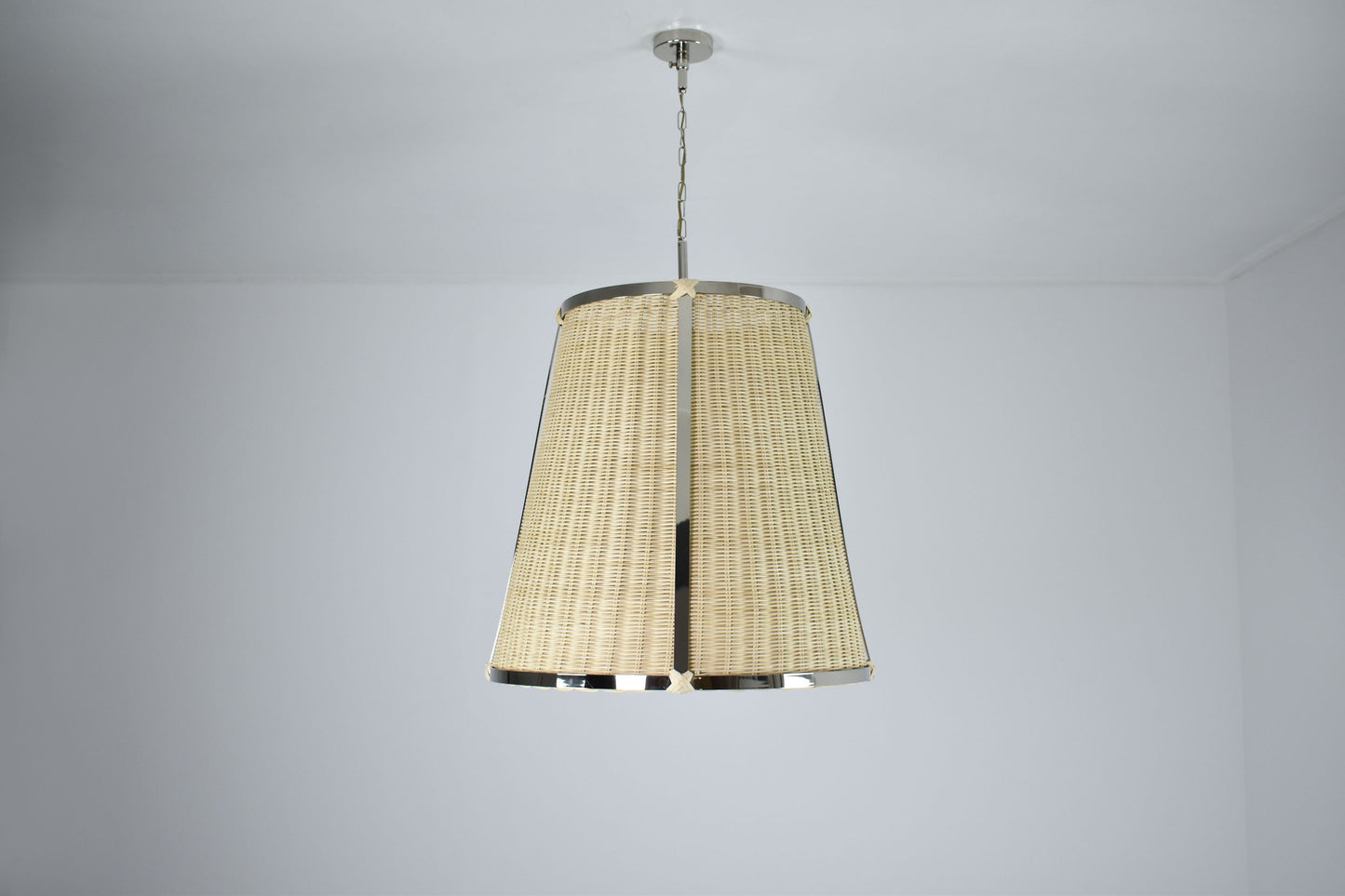 The Caeli-A contemporary handcrafted made-to-measure pendant light fixture features an expertly handcrafted nickel-plated structure and a hand-woven rattan shade. This piece creates a warm and inviting ambiance, perfect for living areas or kitchen island lights.