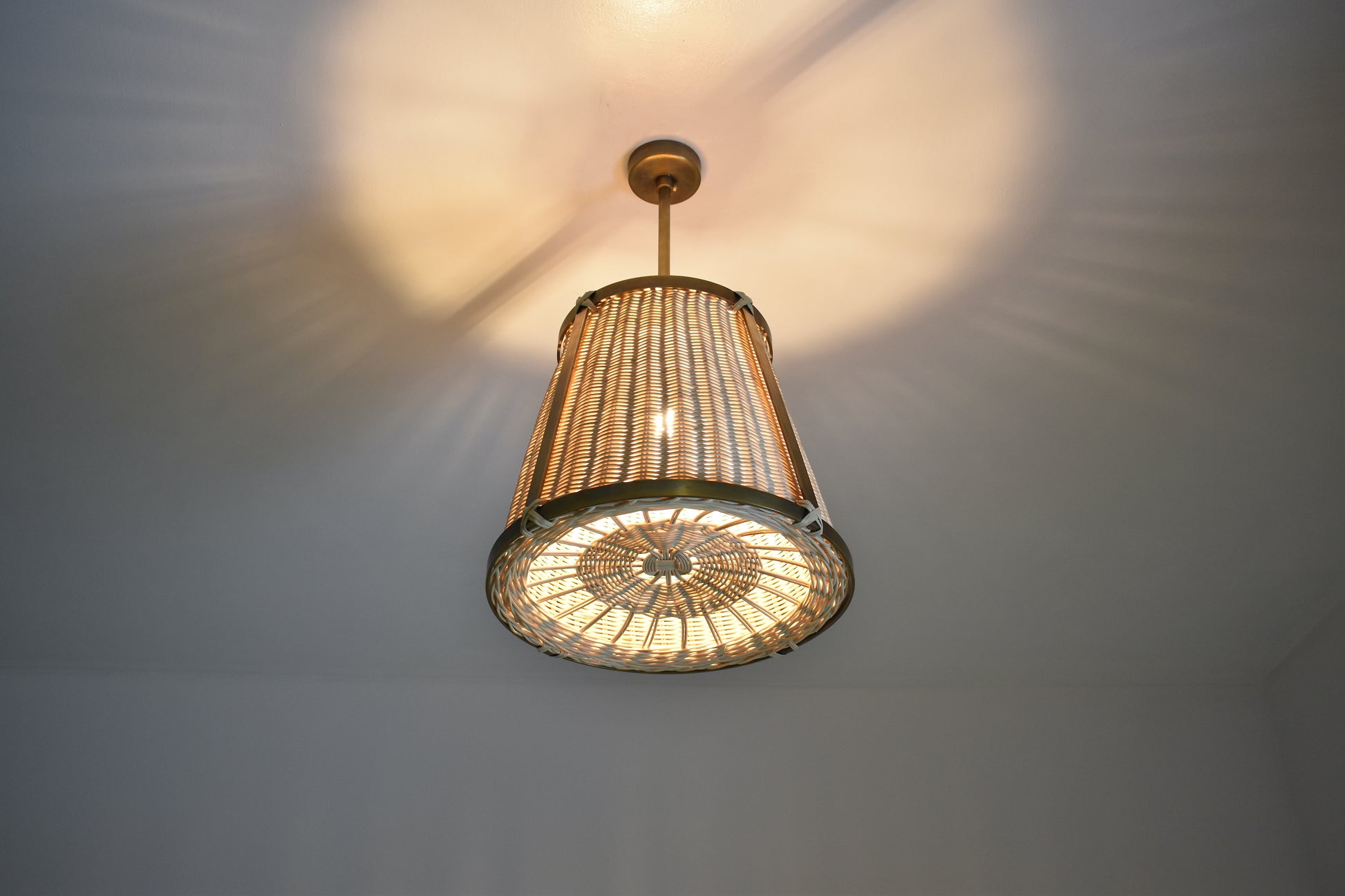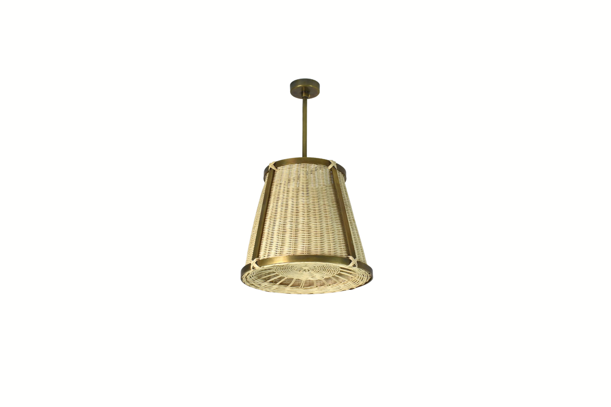 The Caeli-S2 is the smaller version of the Caeli-S1 pendant light fixture and features an expertly handcrafted brass structure and a hand-woven rattan shade. This piece creates a warm and inviting ambiance, perfect for living areas or kitchen island lights.