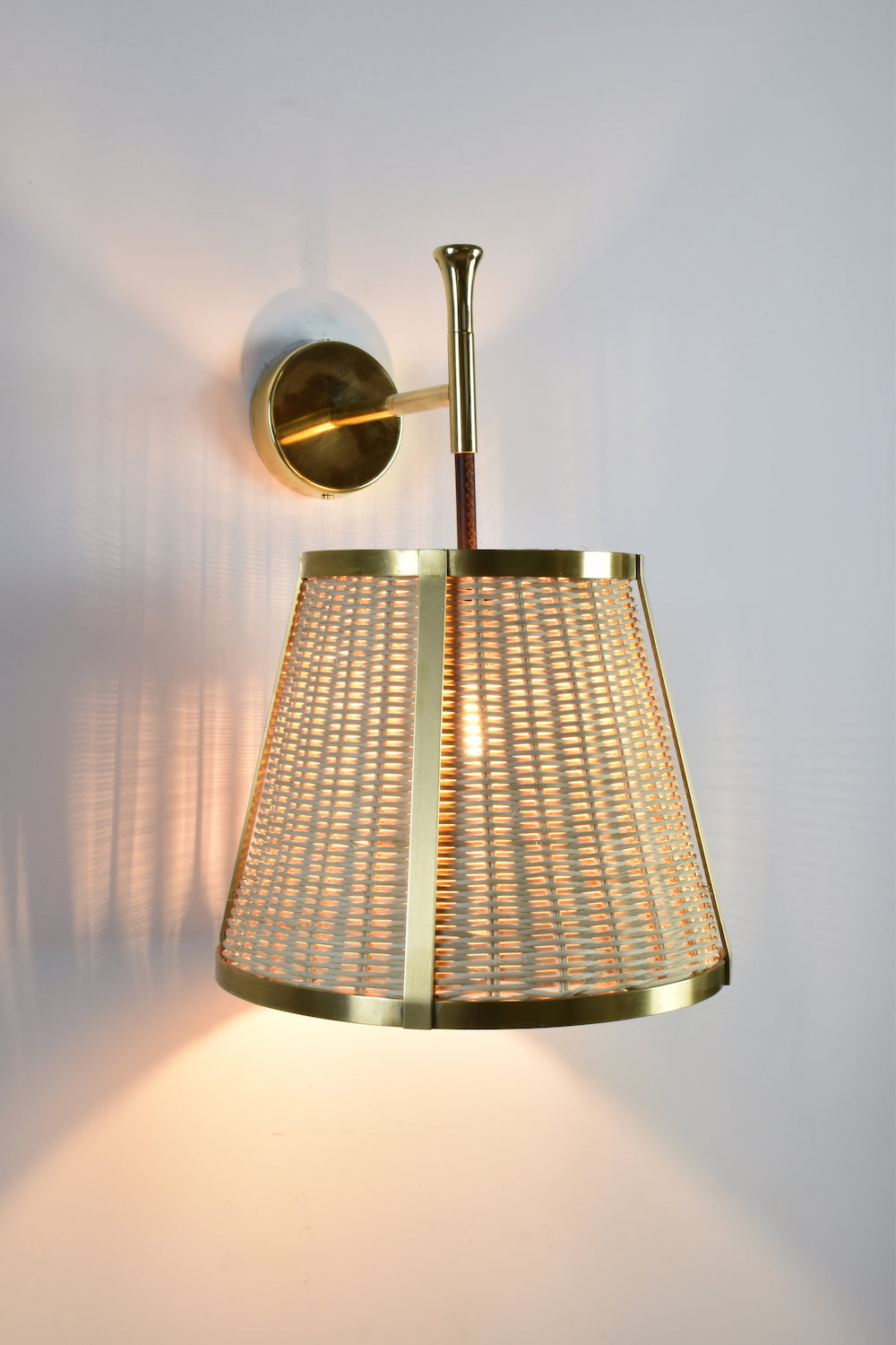 The Caeli-w4 is a wall light handcrafted with a modern brass structure and hand-weaved rattan. The bottom of the stem is adorned with a sheathed leather detail hand-sewn by artisan saddle workers. The colour of this leather is available in brown, black, green, and red.