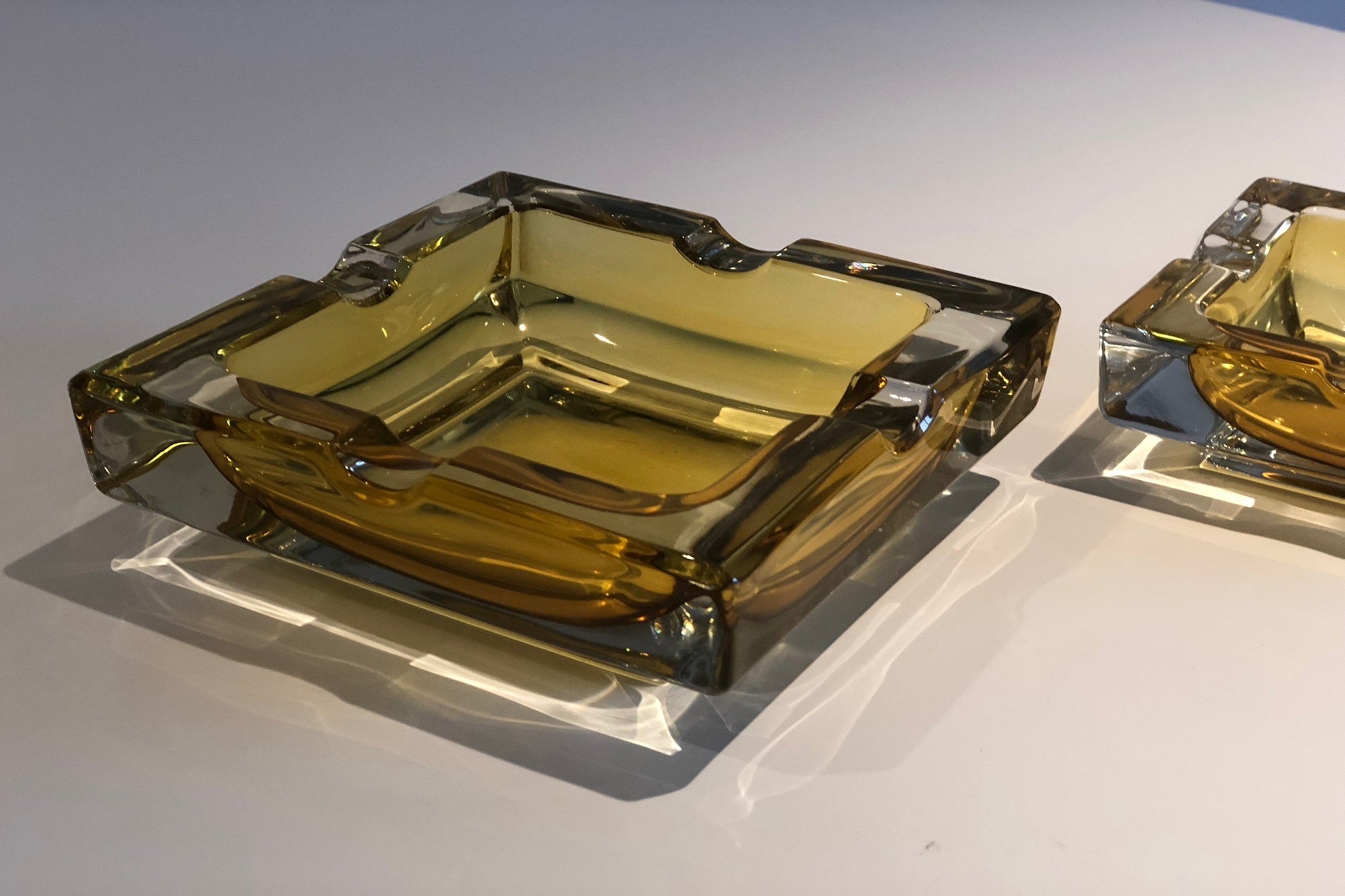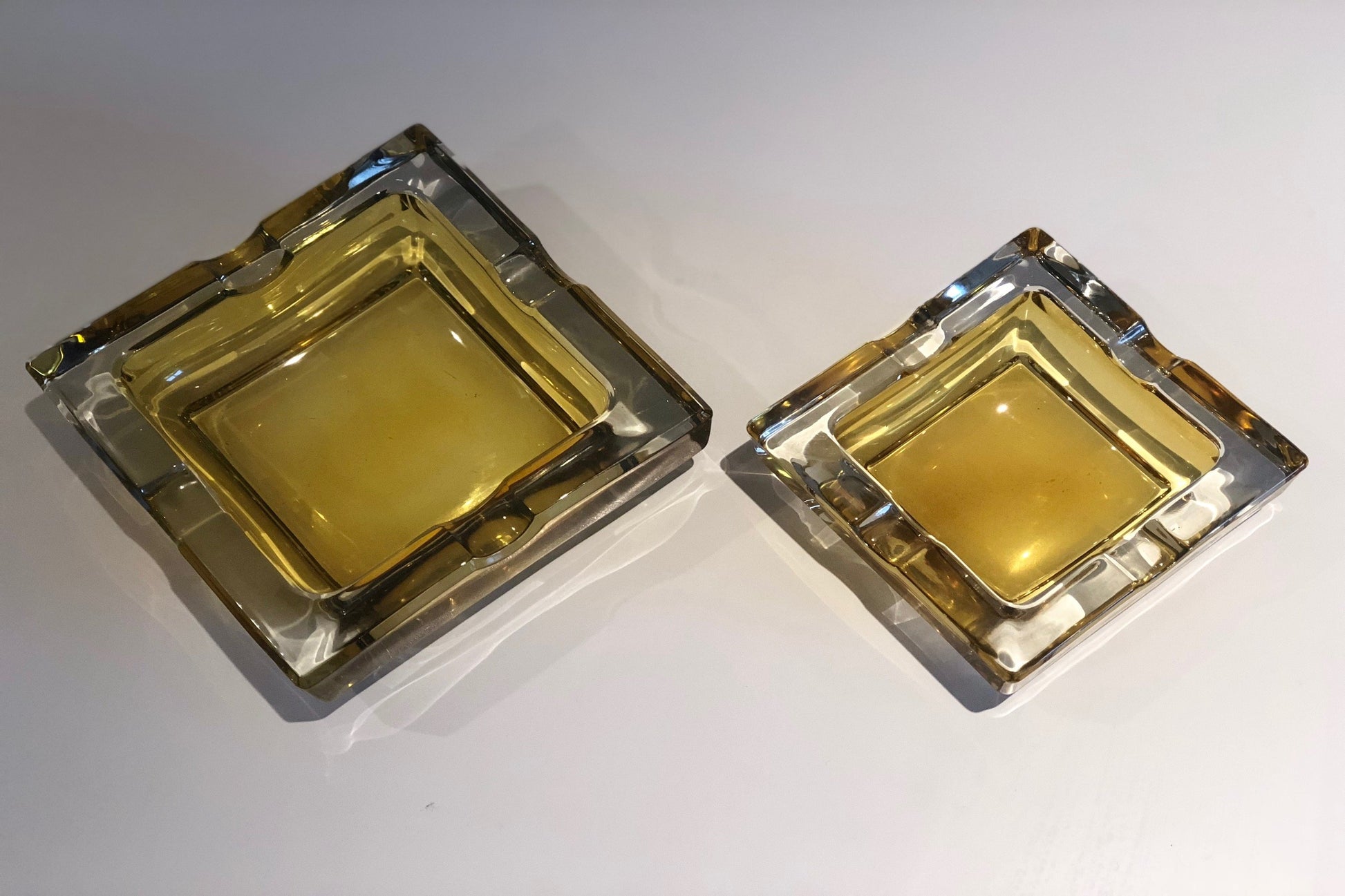 A pair of midcentury vintage heavy glass square ashtrays of two different sizes circa 1960s in rectangular Art Deco design of bicolour transparent and yellow hues. France, circa 1950s. Beautiful condition with very light age related signs. Measures: 14 cm x 14 cm 5 cm 11 cm x 11 cm x 4 cm.