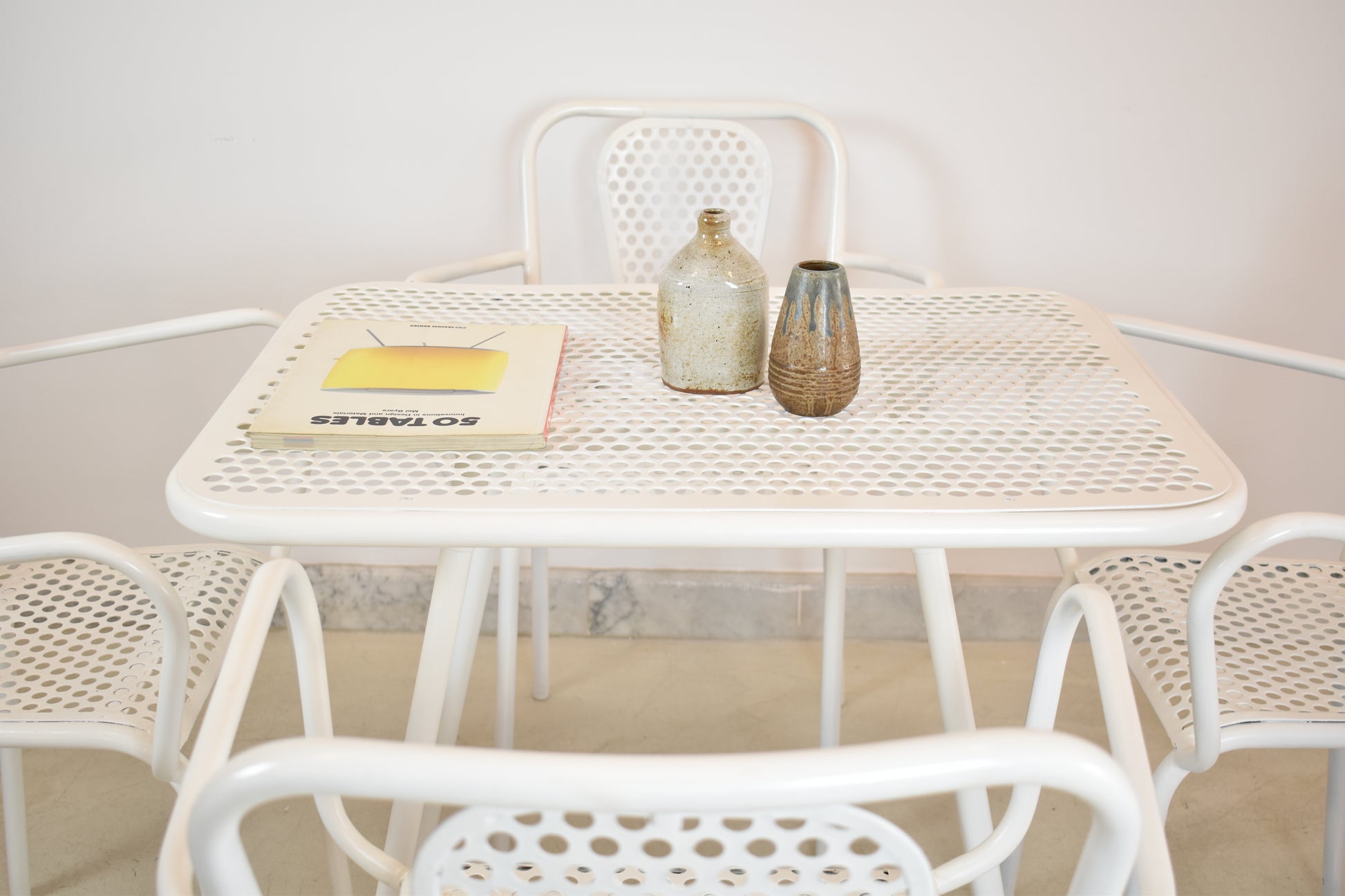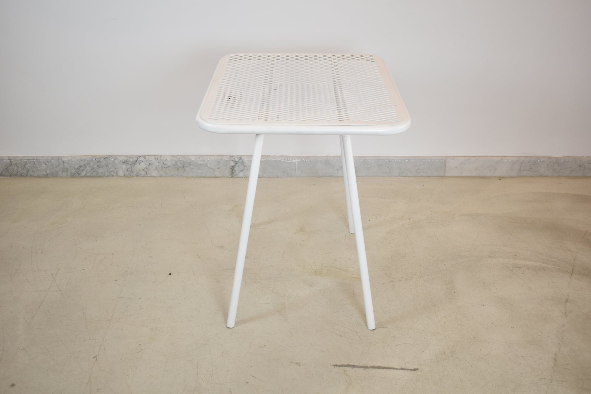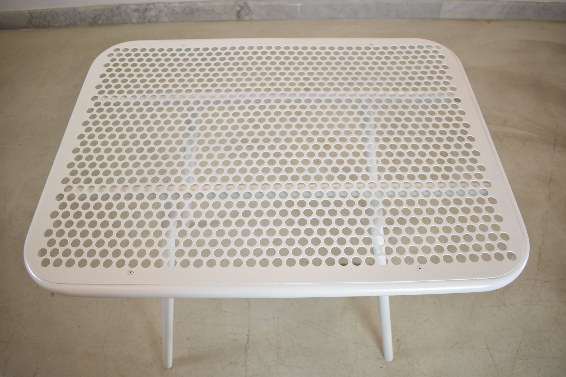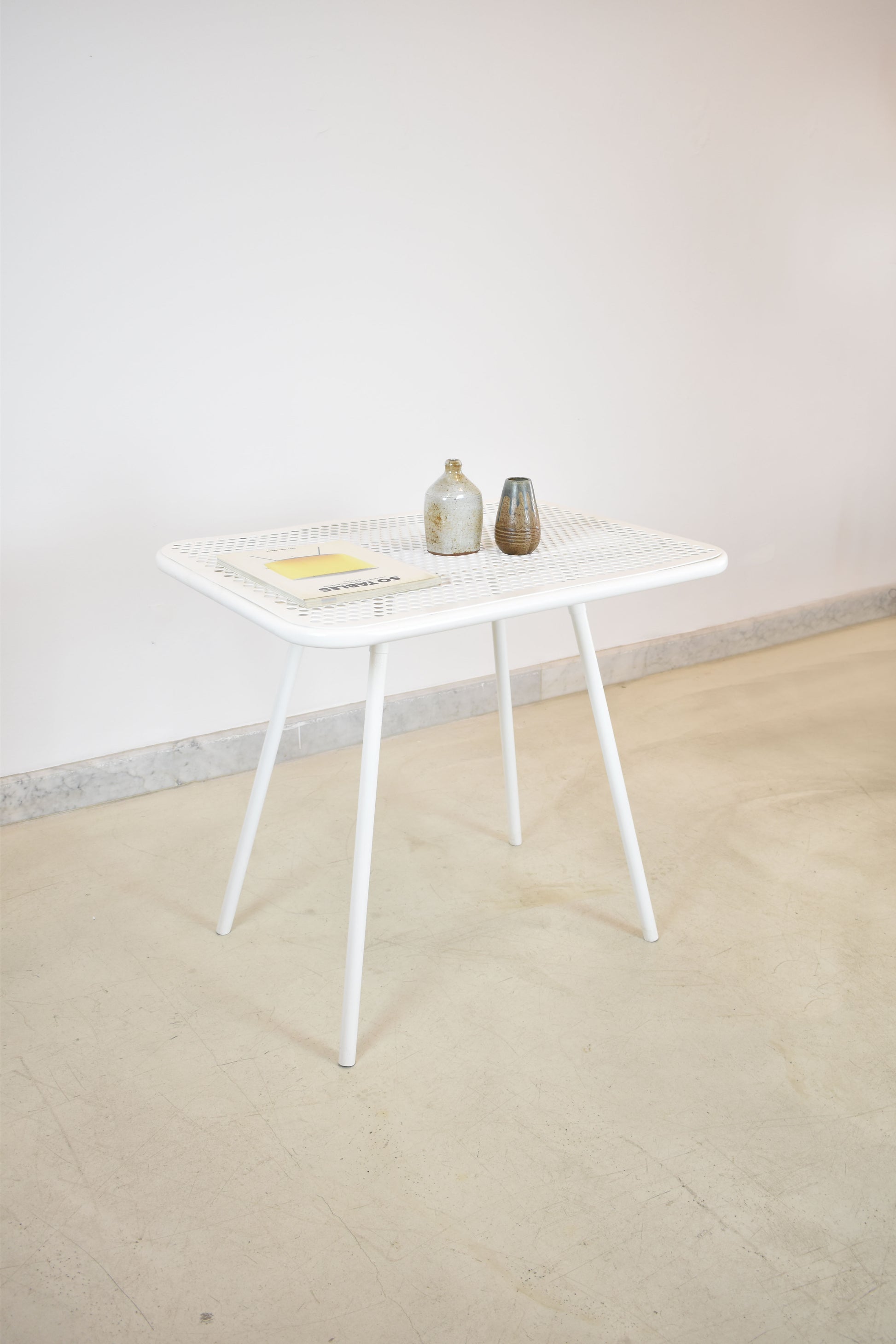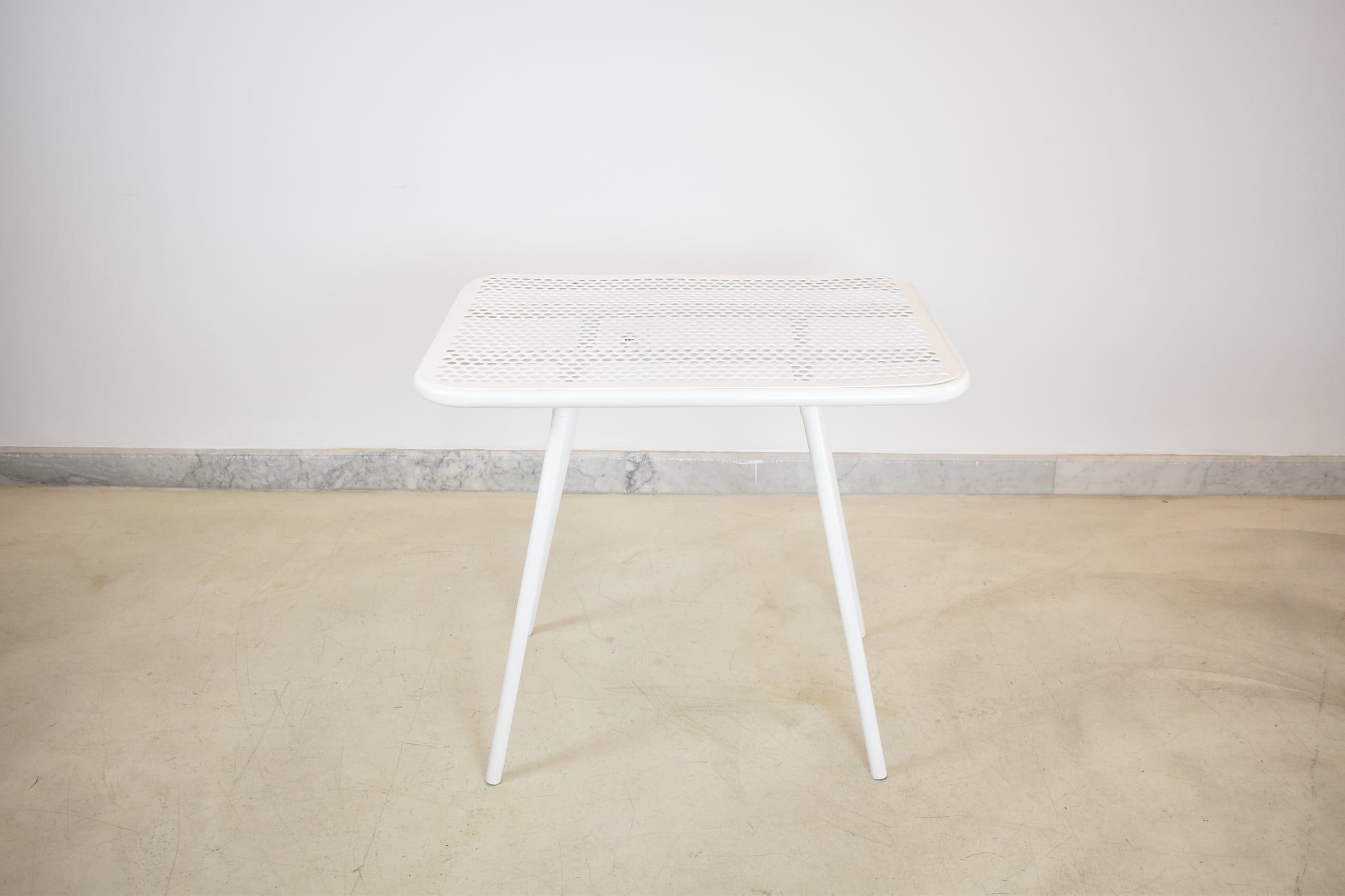 White lacquered tubular steel with perforated metal top. The rounded rectangular surface echoes the graphic lightness of the chairs, while the slender legs create a refined, architectural silhouette.