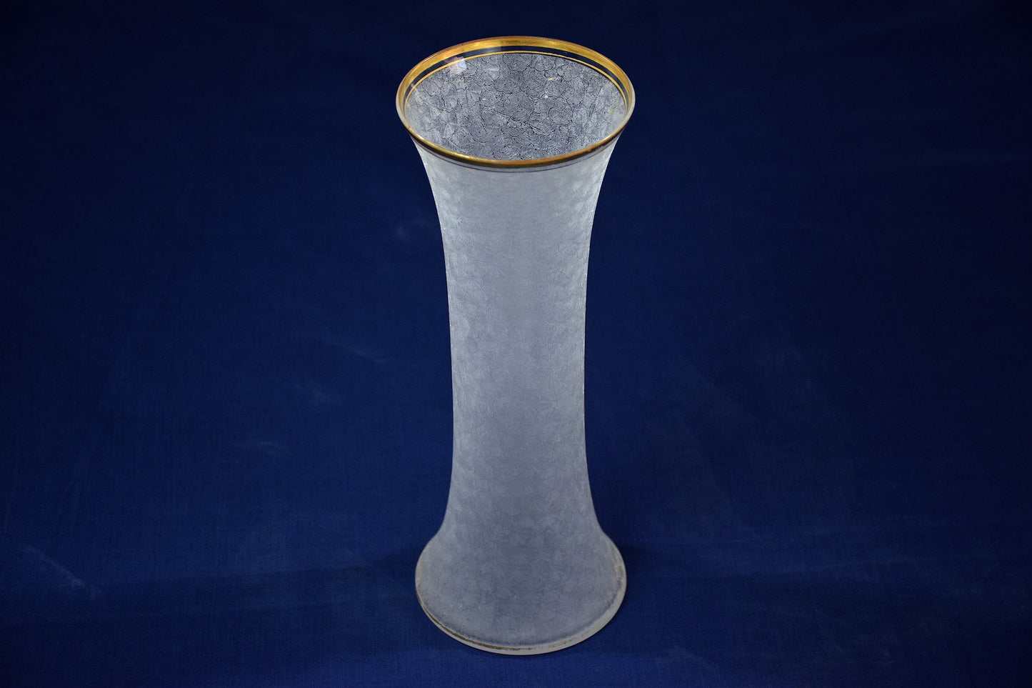20th century french vintage glass vase composed of intricate glass etchings allover and a beautiful gold trim.
