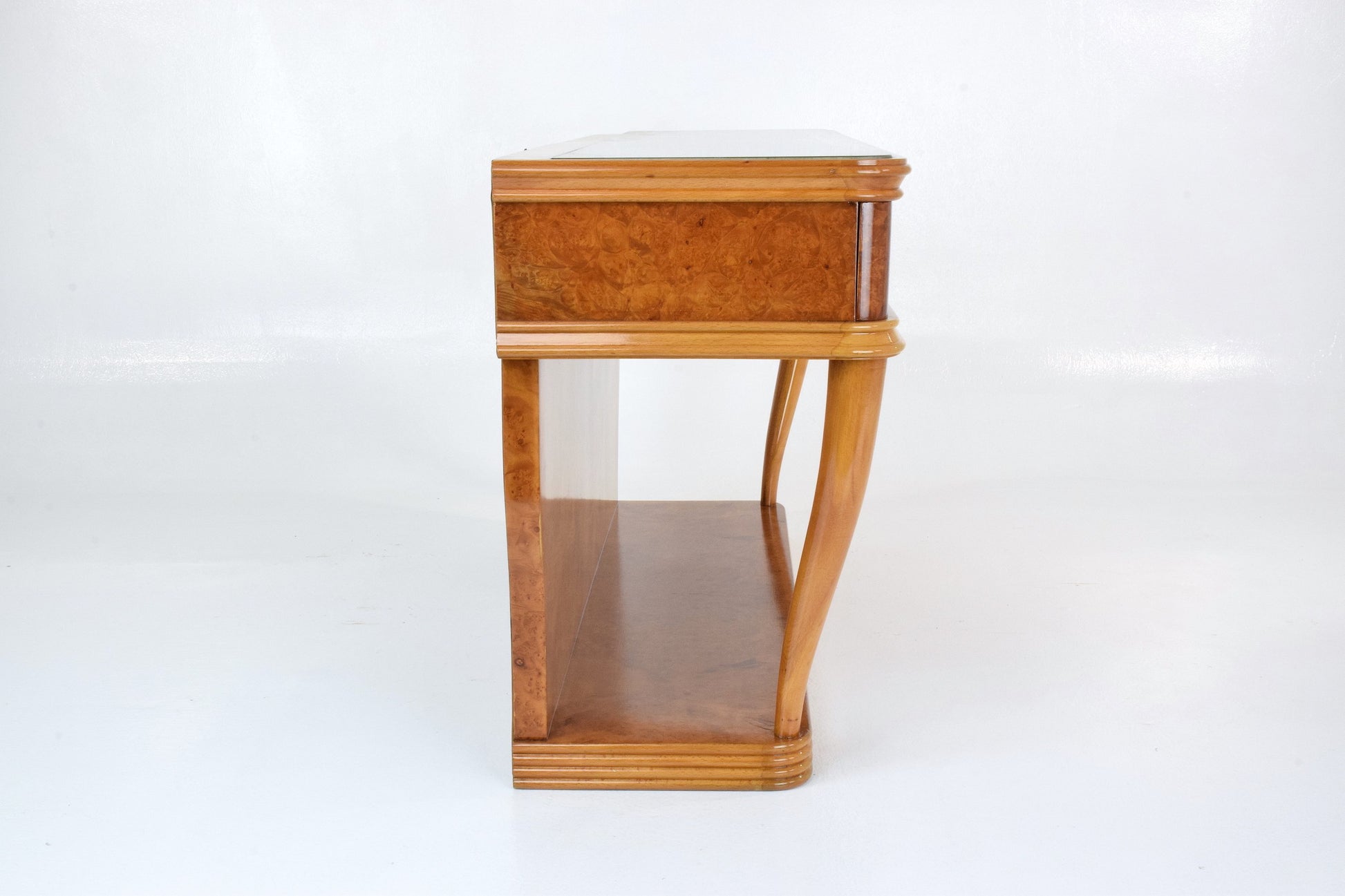 Midcentury Italian dresser or vanity composed of bird's-eye maple veneer, beechwood frame, a glass tabletop with a sheath of coloured papier underneath and a detachable vintage mirror. The console has two drawers with brass handles. Italy, circa 1950s.