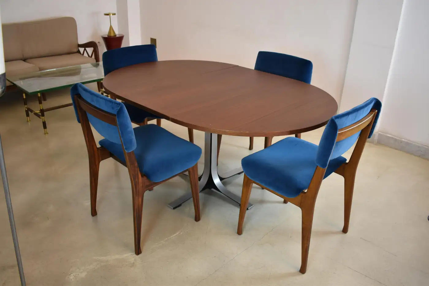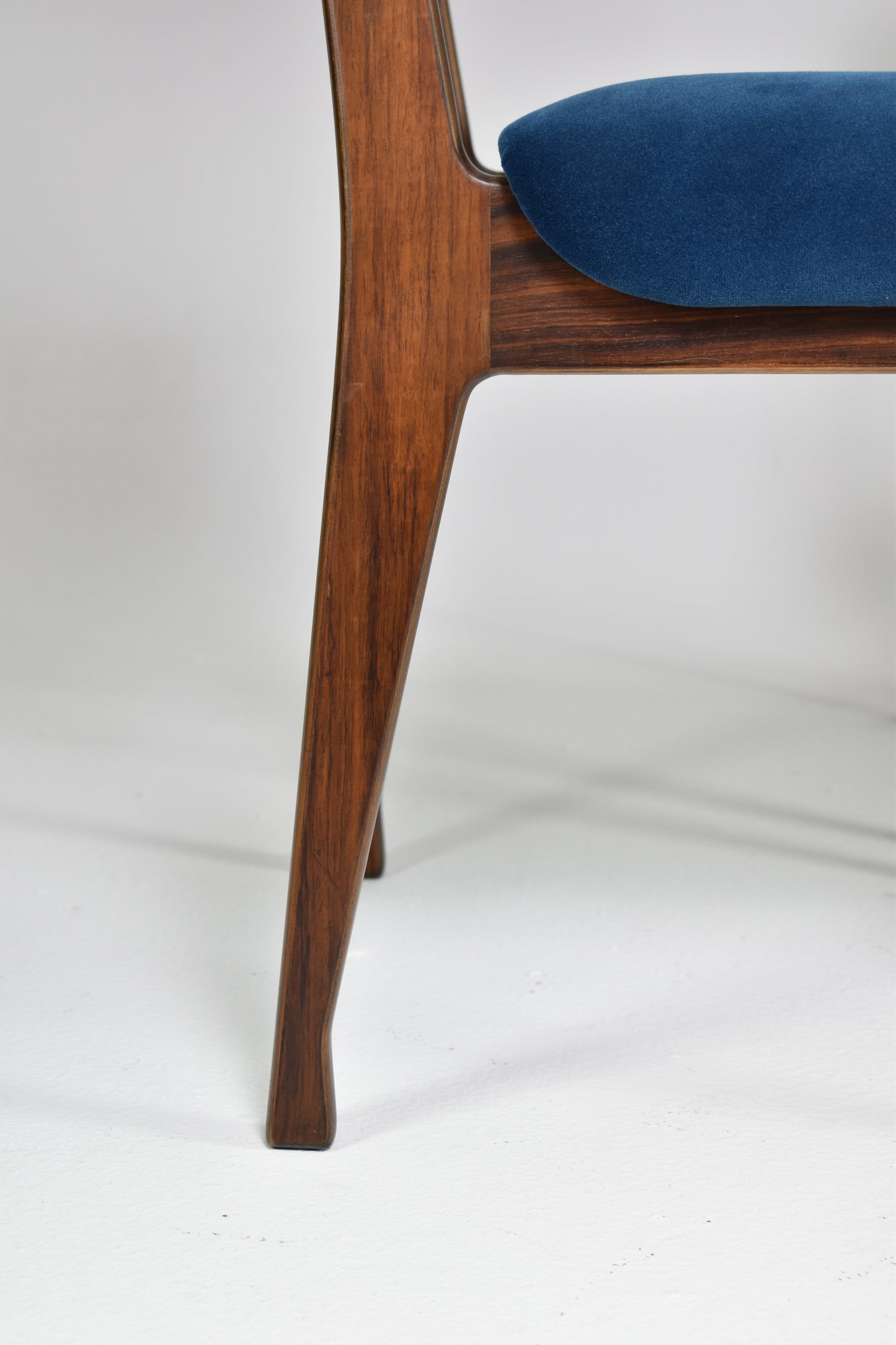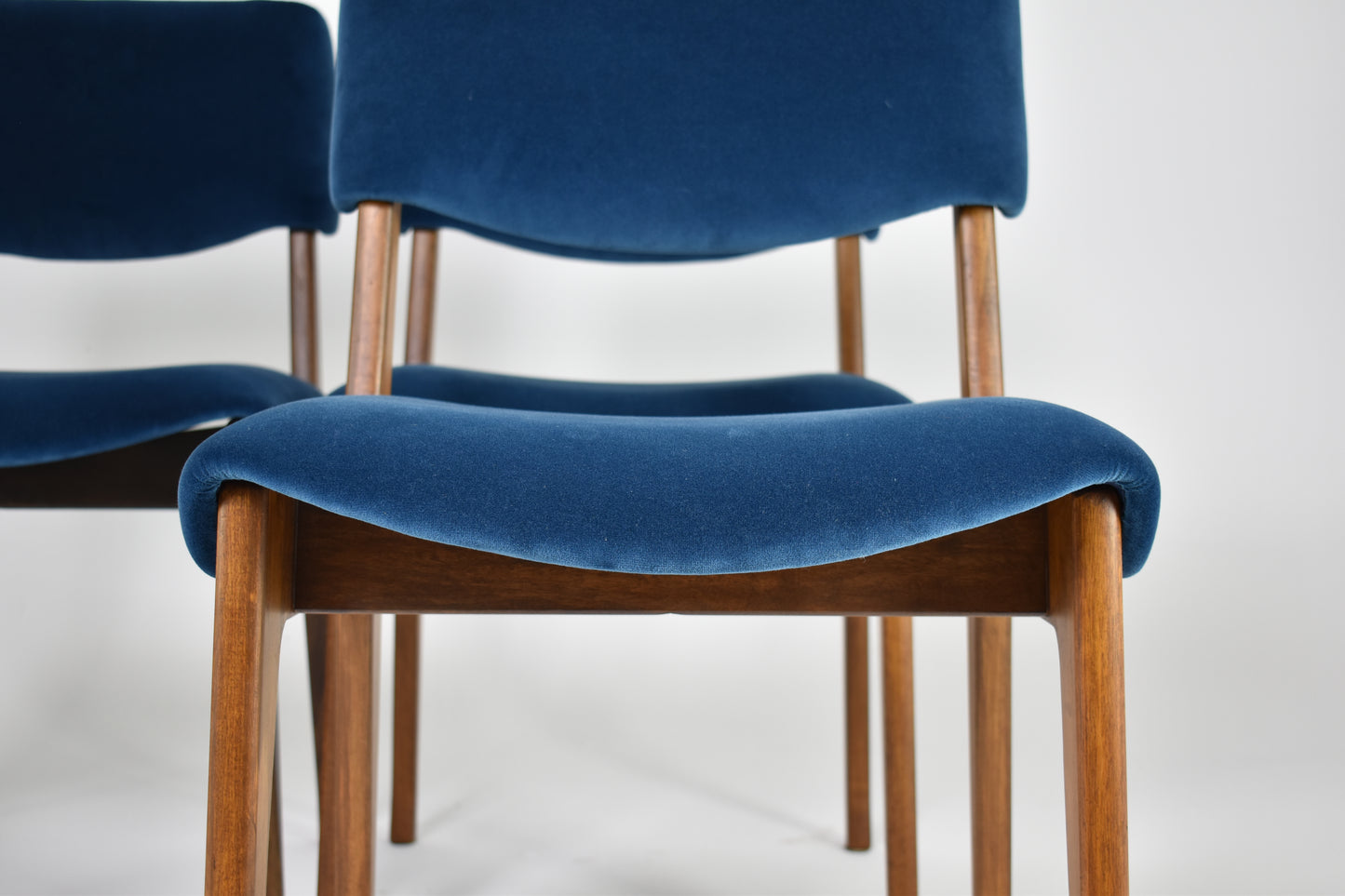 Set of four restored Italian dining chairs by Ico Parisi for MIM from the 1950s-60s. Crafted from wood and reupholstered in dark blue velvet. These beautiful collectable pieces are highlighted by their curved seat and backrest. Ico Parisi was an influential Italian architect and designer known for his modernist furniture designs characterized by sleek lines, innovative shapes, and sophisticated craftsmanship.