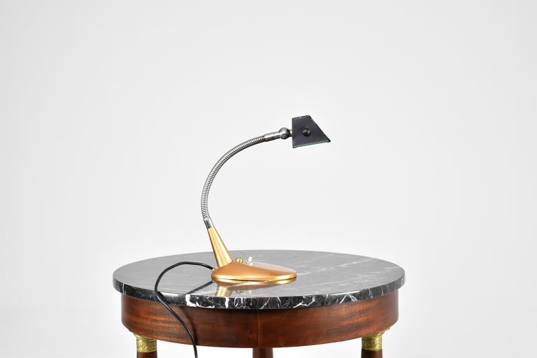 An Italian 1950s vintage desk lamp with an articulating gooseneck arm and diffuser shade. The glass diffuser helps to soften and distribute the light evenly, making these lamps particularly useful for tasks that require focused lighting, such as reading or desk work. Push type button.