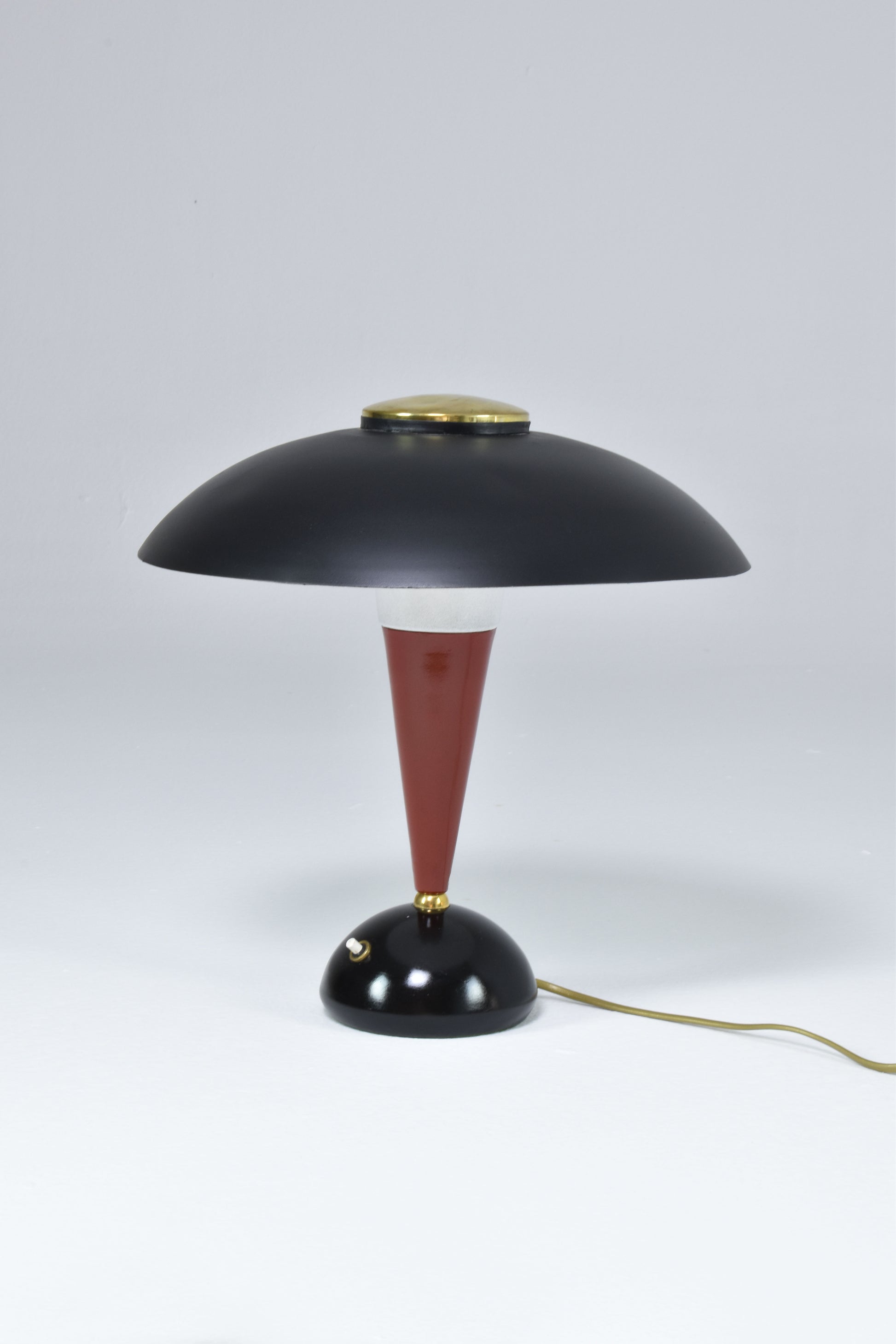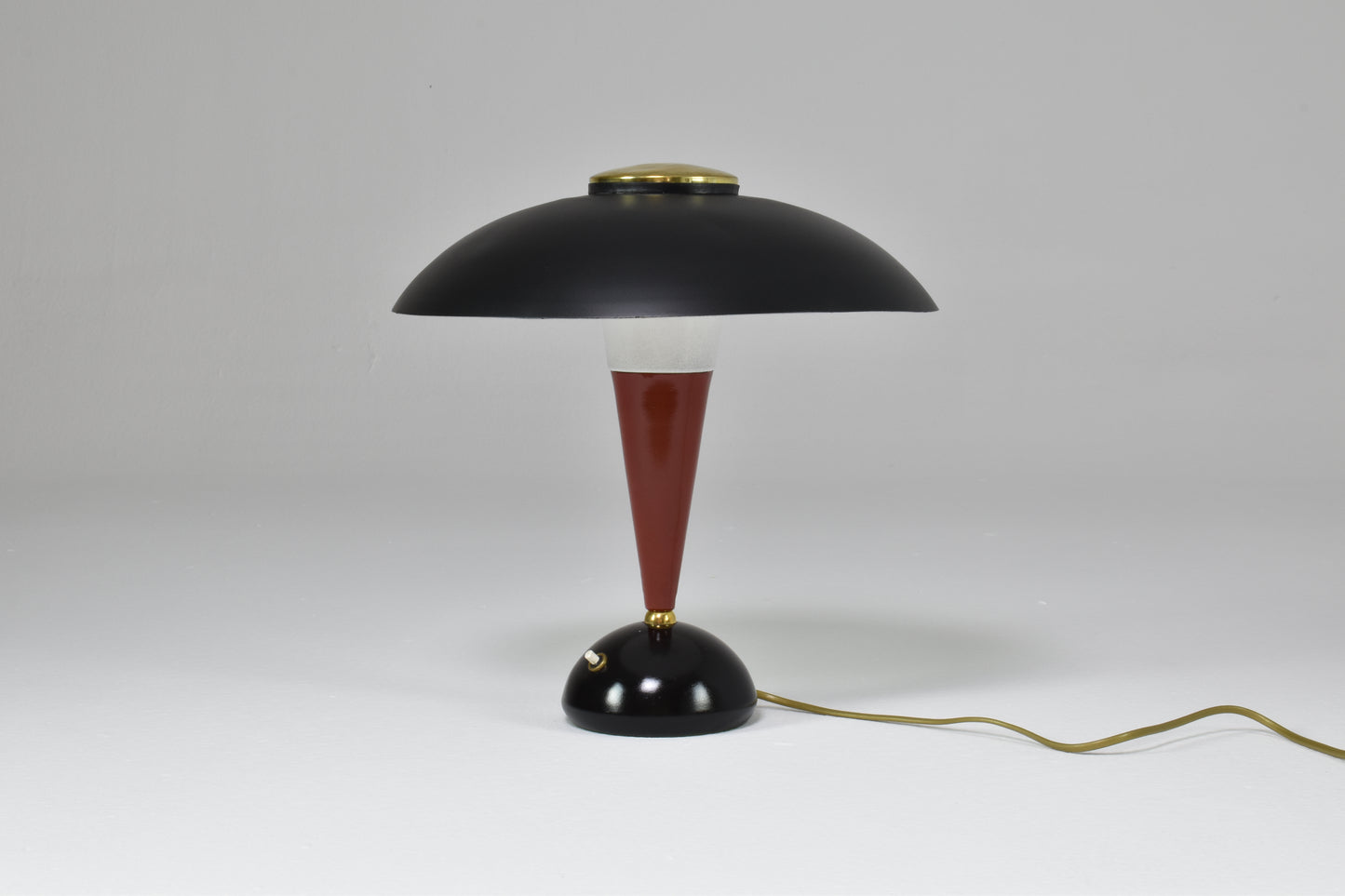 An Italian 1960s table lamp in art deco style designed with a black shade and base and a dark red stem. This accent light is composed of aluminium and pretty gold brass accents.