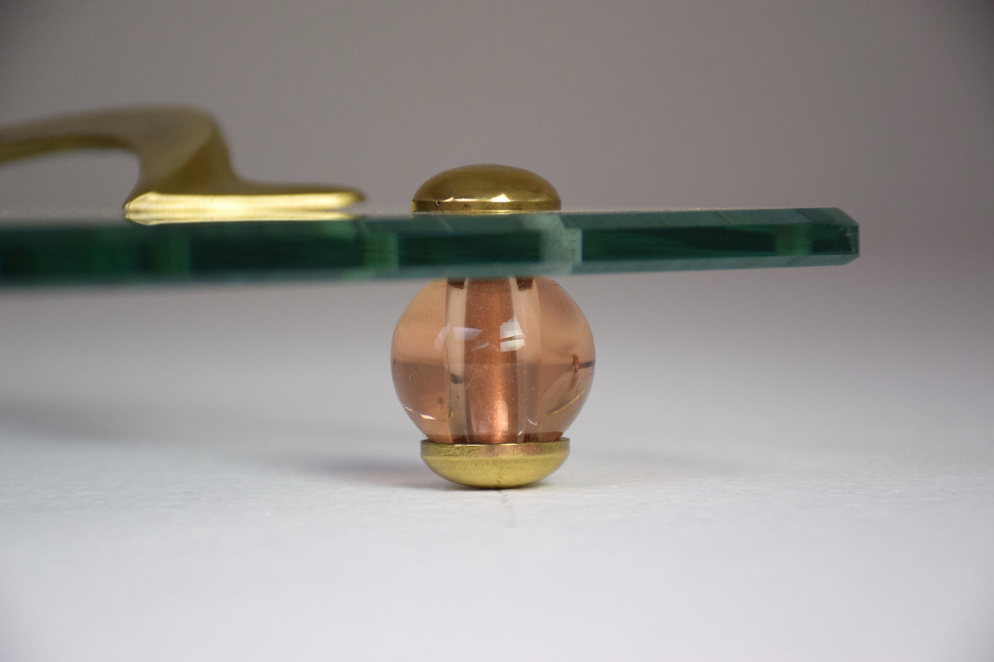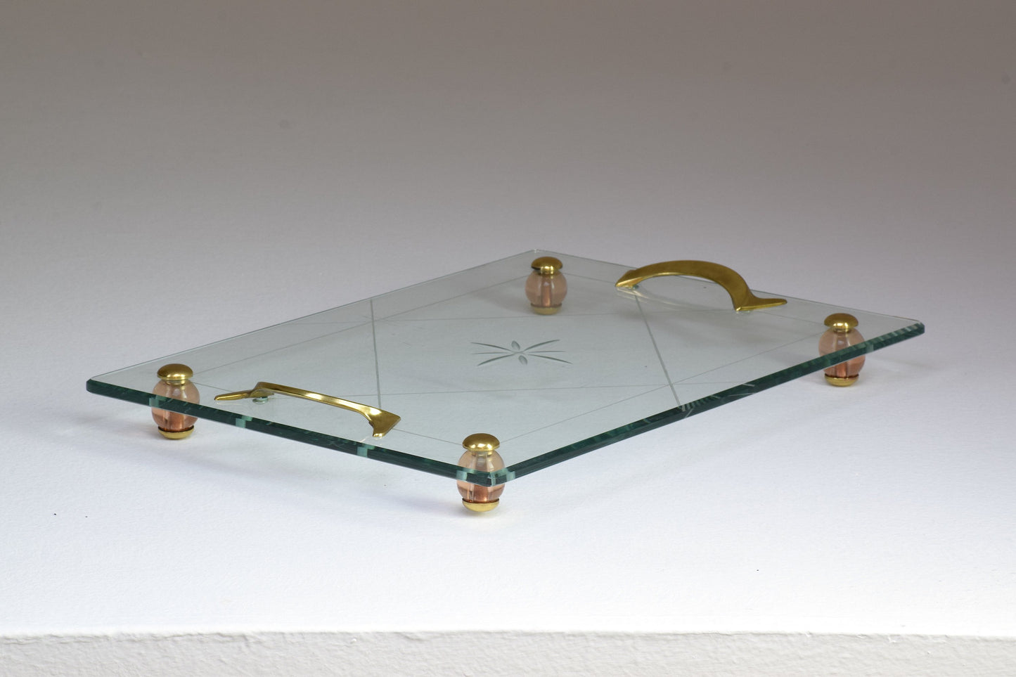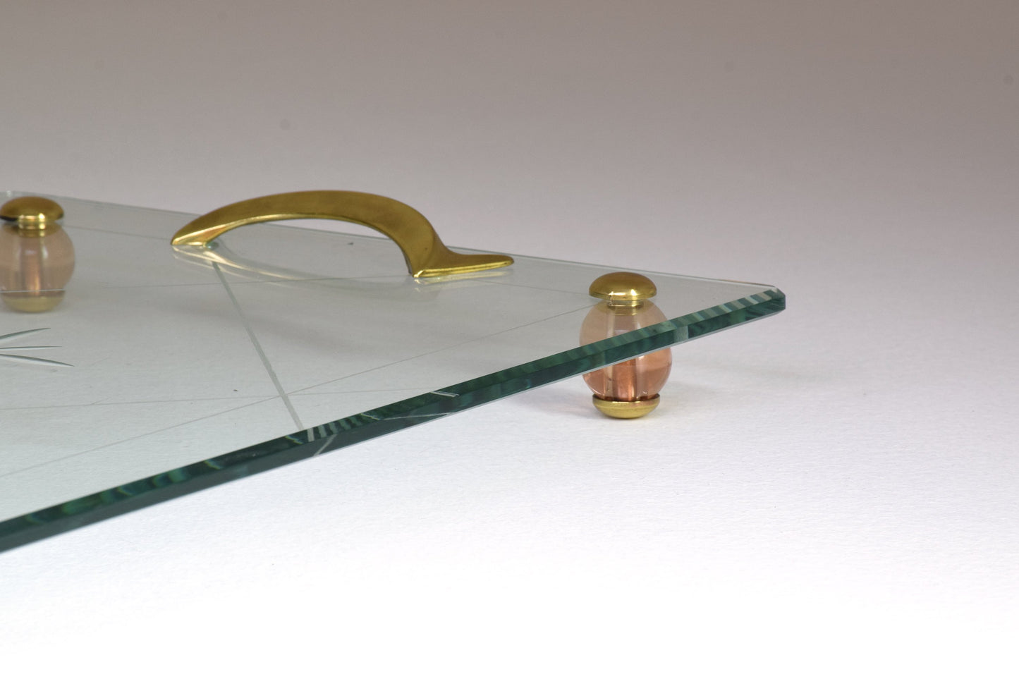 A wonderful rectangular glass platter with brass and glass details and etched patterns attributed by iconic Italian manufacturer Fontana Arte Italy. Circa 1950's