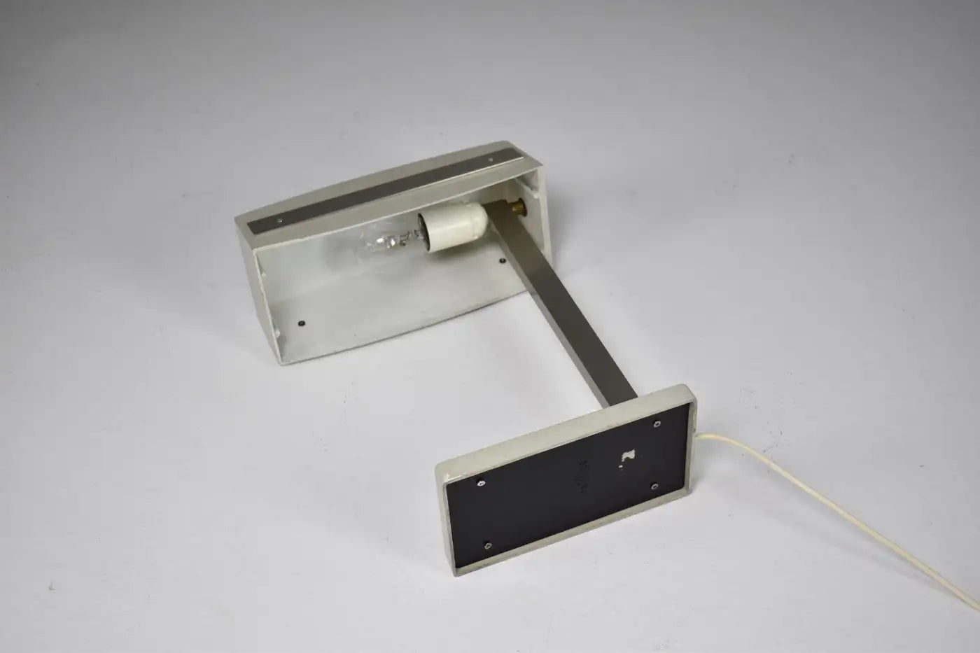 A 1960s-1970's desk lamp by the iconic collectible Italian manufacturer Stilnovo. This mid-century design is composed of a rectangular-shaped base with a light switch in a painted light grey color that matched the shade. This almost robotic design rotates left and right from the shade.