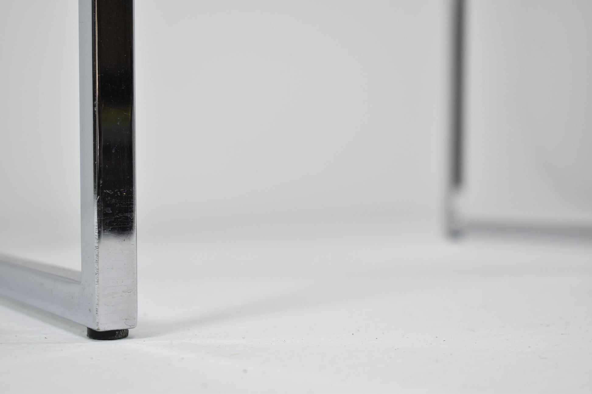 A striking example of 1970s Italian modernism, we are pleased to present this rare set of SQ-AL dining chairs designed by Willy Rizzo. The sleek chrome frames form a geometric silhouette, balancing sharp angles with a refined linearity.