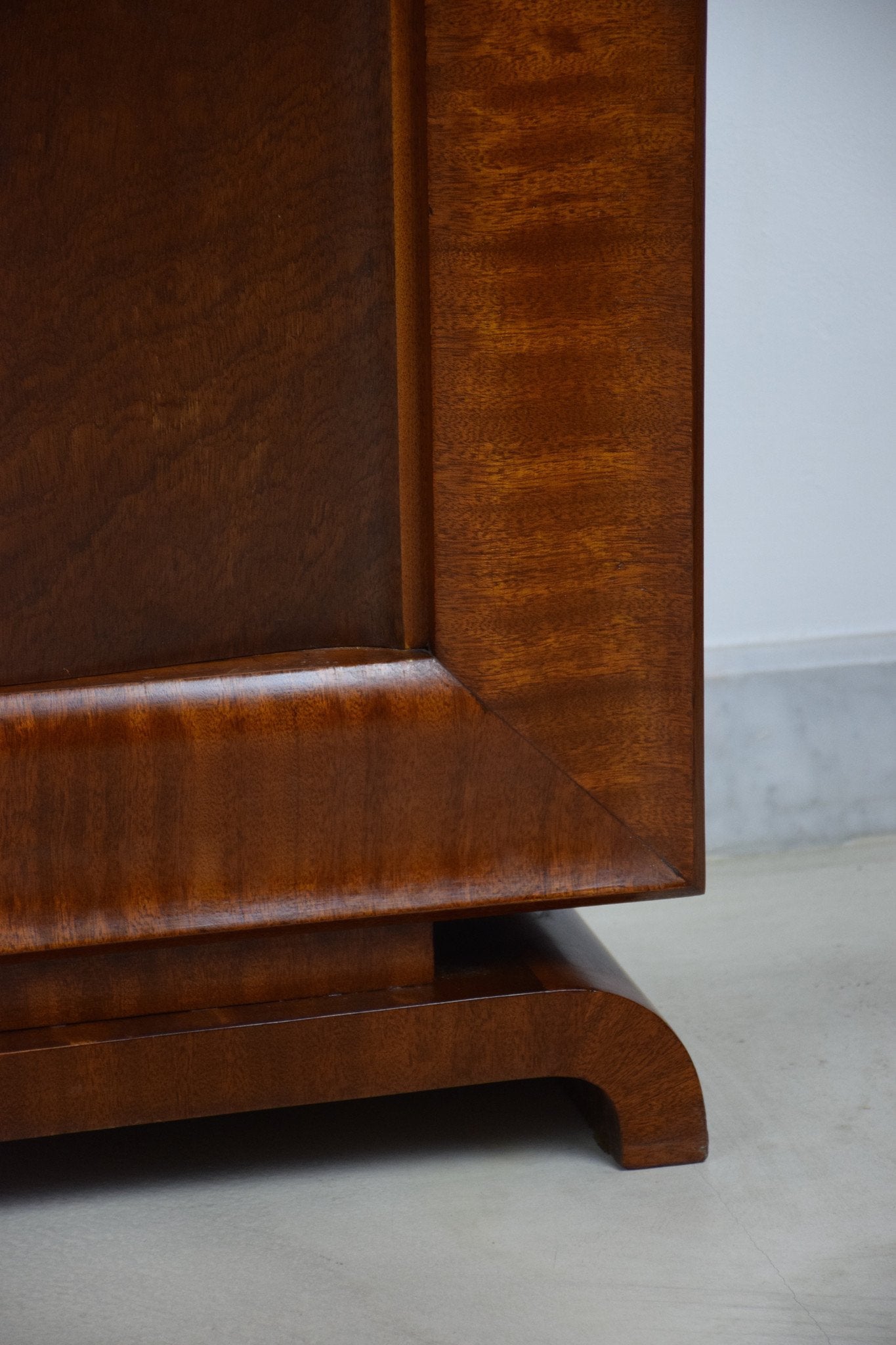 Elegant 1930's light-up display cabinet in mahogany veneer with sliding glass doors, two glass shelves and bottom sideboard with one keyed door. A great representation of the Art Deco style. Excellent restored condition.
