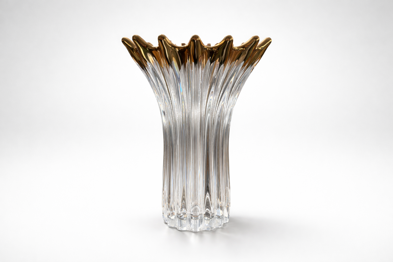 Hand-formed clear crystal with vertical flutes and a sculptural crown mouth picked out in warm amber. Heavy, ground and polished base; throws beautiful light on a table or shelf. Perfect as a statement vase or a standalone object.