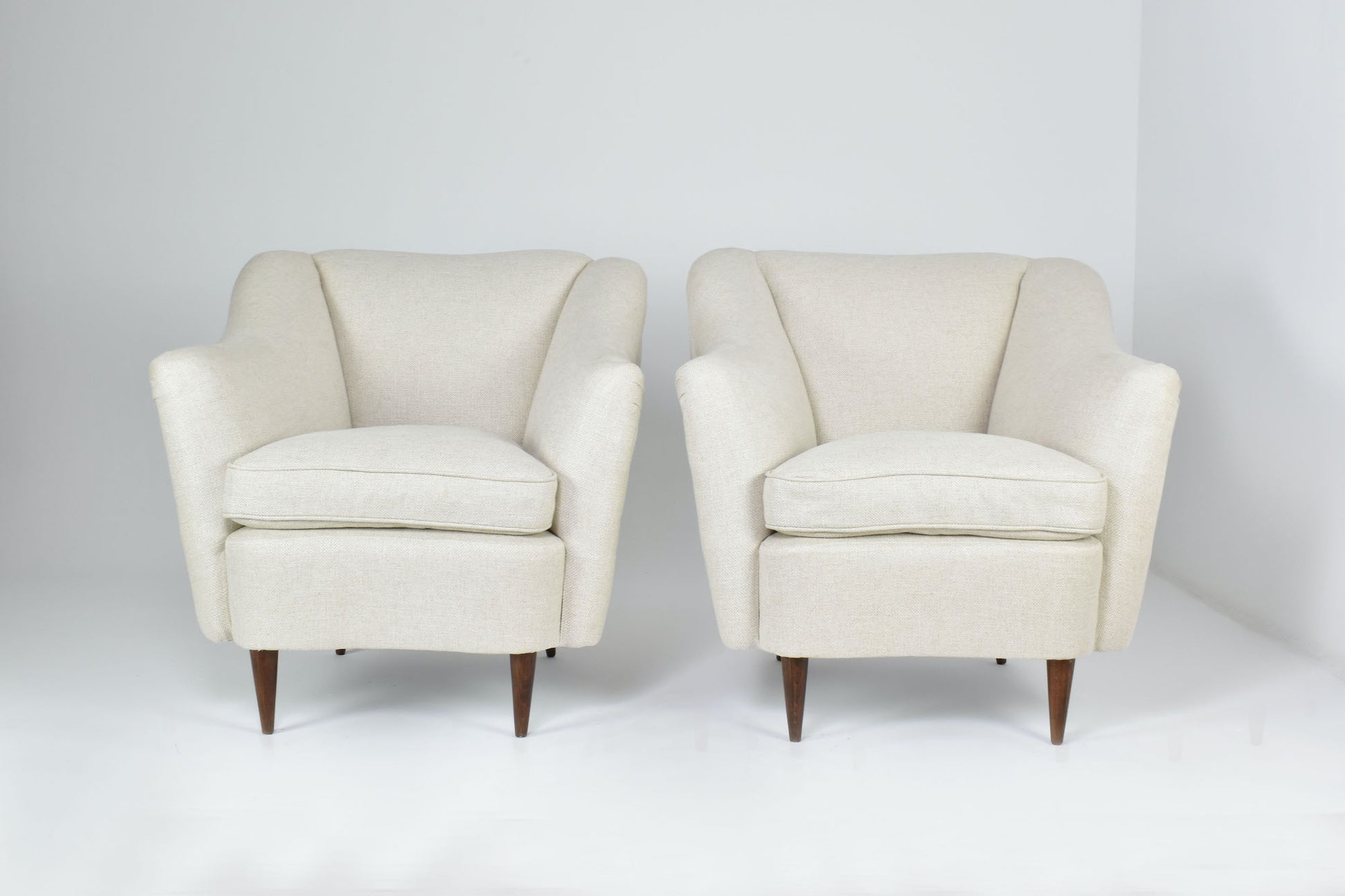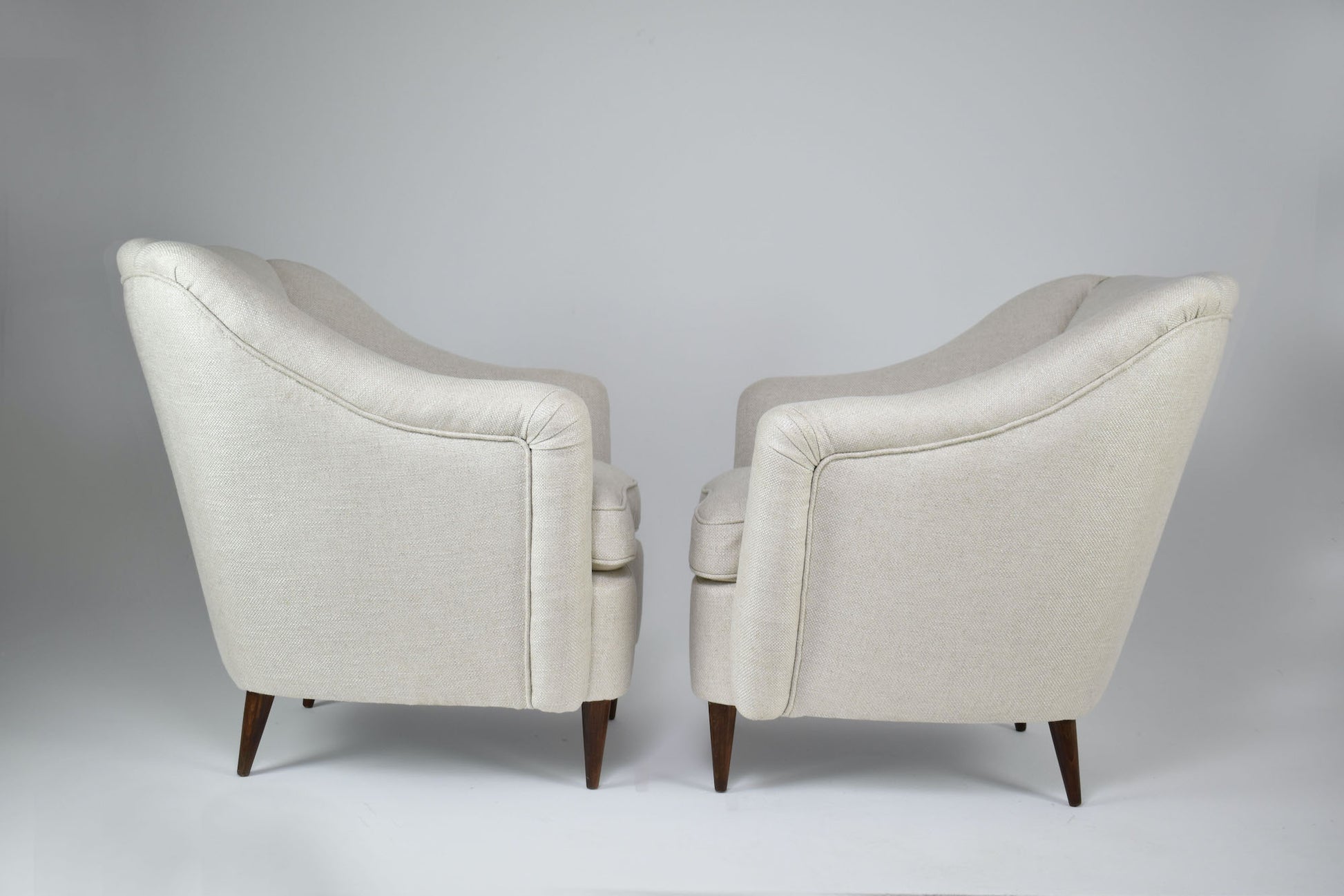 The chairs display the refined, sculptural language associated with ISA’s mid-century production: enveloping backs with gently flared sides, integrated armrests flowing into the structure, and balanced proportions elevated by solid tapered walnut legs. A hallmark of Milanese design of the period.