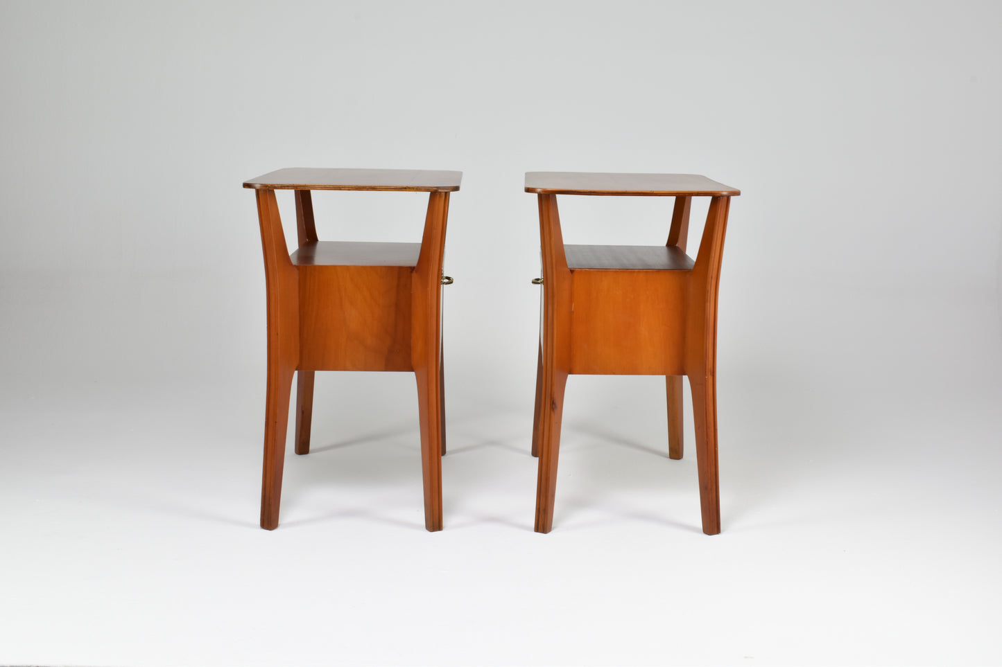Striking set of two Italian maple wood nightstands attributed to Gio Ponti for Cantu from the 1950s in meticulously restored condition. These mid-century tables are highlighted by their sophisticated geometrically shaped tabletops and an intricate central drawer with striped panels and brass handle.