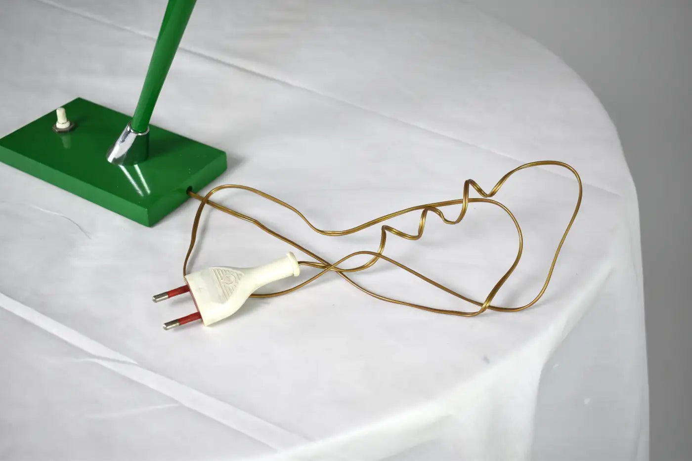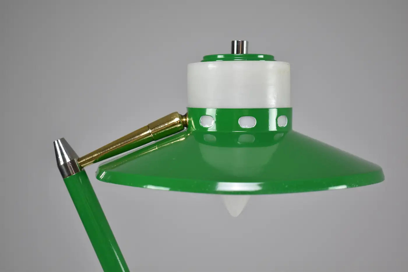 Stylish bright green Italian mid-century modern desk or table lamp by Stilux with adjustable shade and push type button at the base. This superb design is highlighted by brass and silver metallic details.