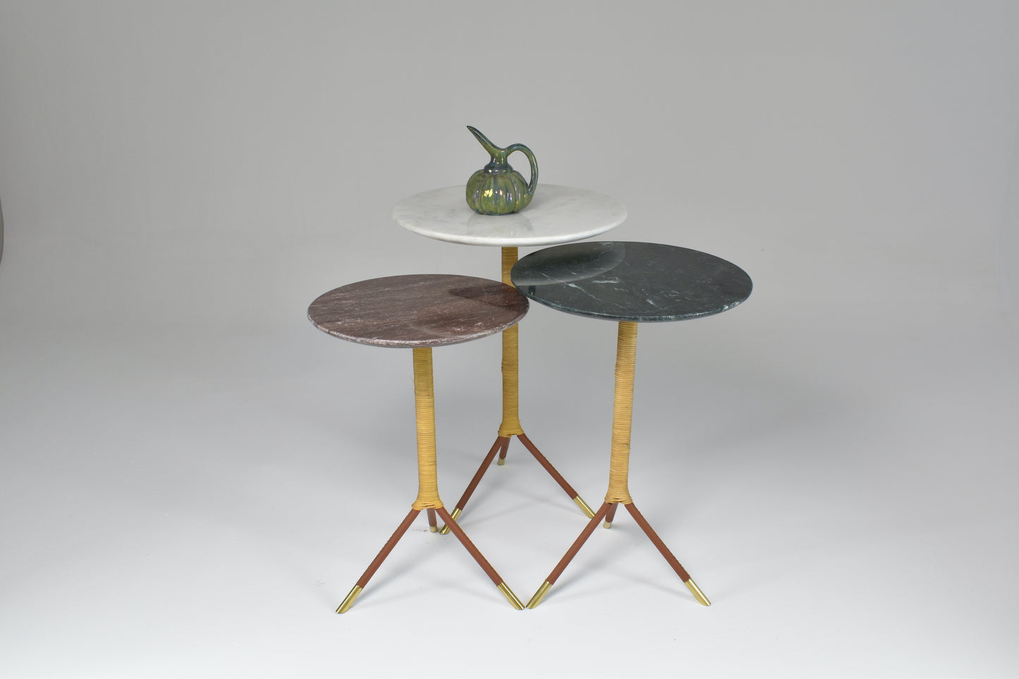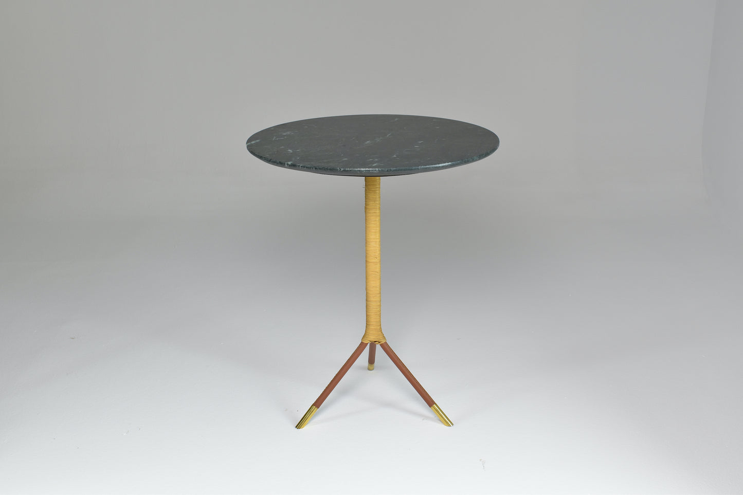 A customizable made-to-measure side table designed with a thick polished marble tabletop, a steel structure, and a sustainably sourced natural rattan core. The hand-sewn leather sheathed tripod structure is highlighted by chic solid brass endings.