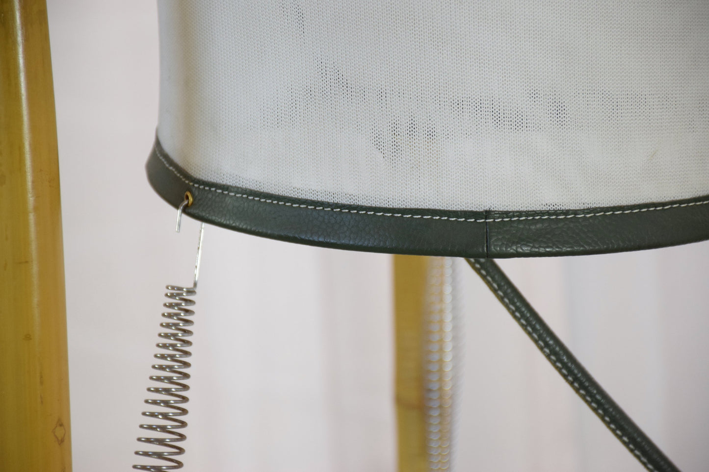 A pair of 20th-century Italian vintage floor lamps and side tables circa 1970's designed in bamboo and brass with tripod structures and Asian lantern-style fabric shades with black leather details attached by springs. Each lamp is comprised of two circular glass shelves. Original statement pieces, of beautiful craftsmanship.