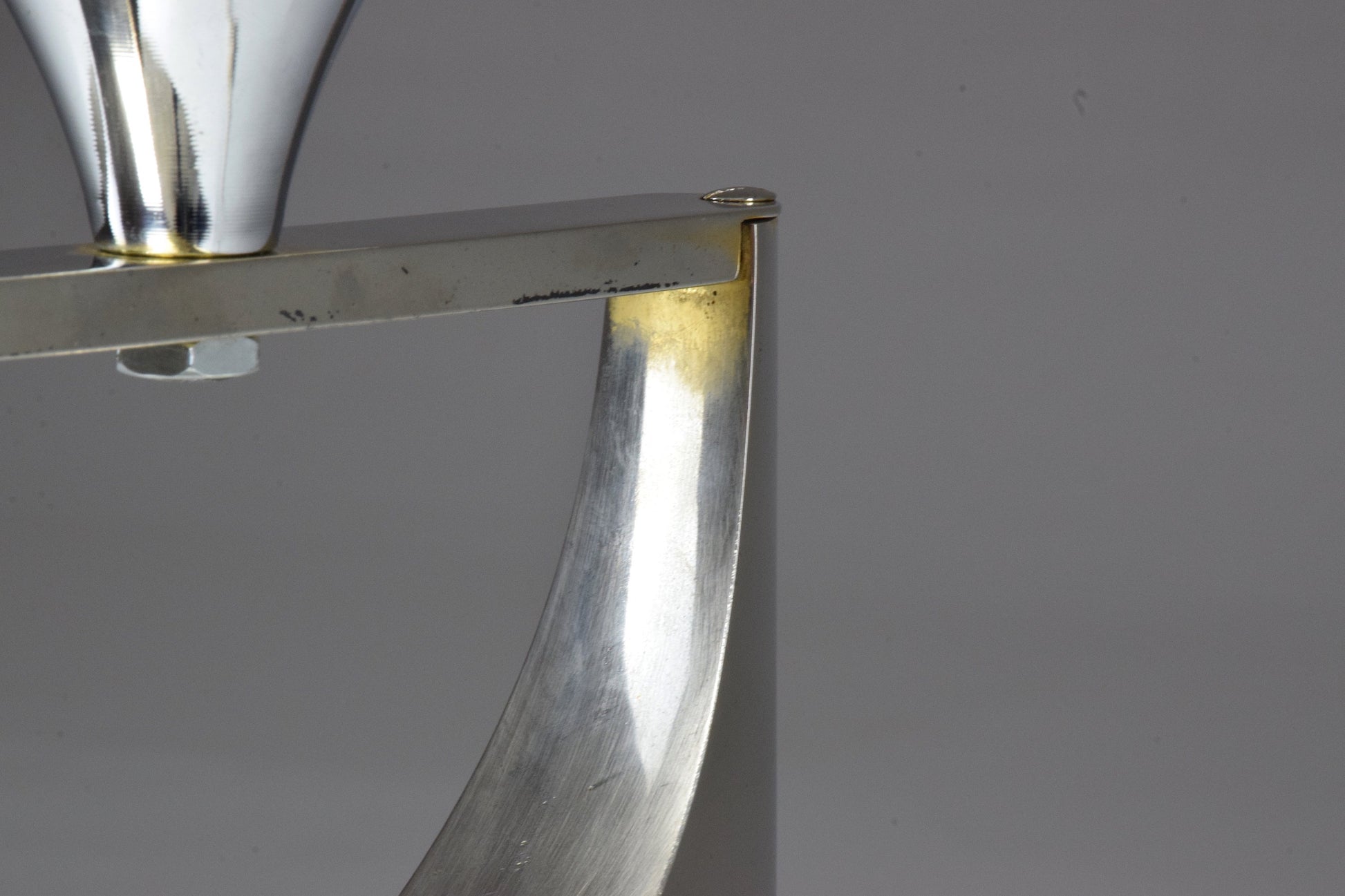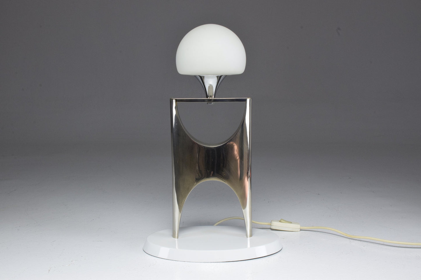 A 20th century vintage sculptural statement lamp of Italian or French original circa 1950-1960's. This lamp as been fully restored and lightly modified : the initial worn brass plating has been stripped off to reveal an aluminium structure ; the steel white base has been re-lacquered and we have added a new boule shaped shade and steel piece below. The original wiring has been professionally verified.